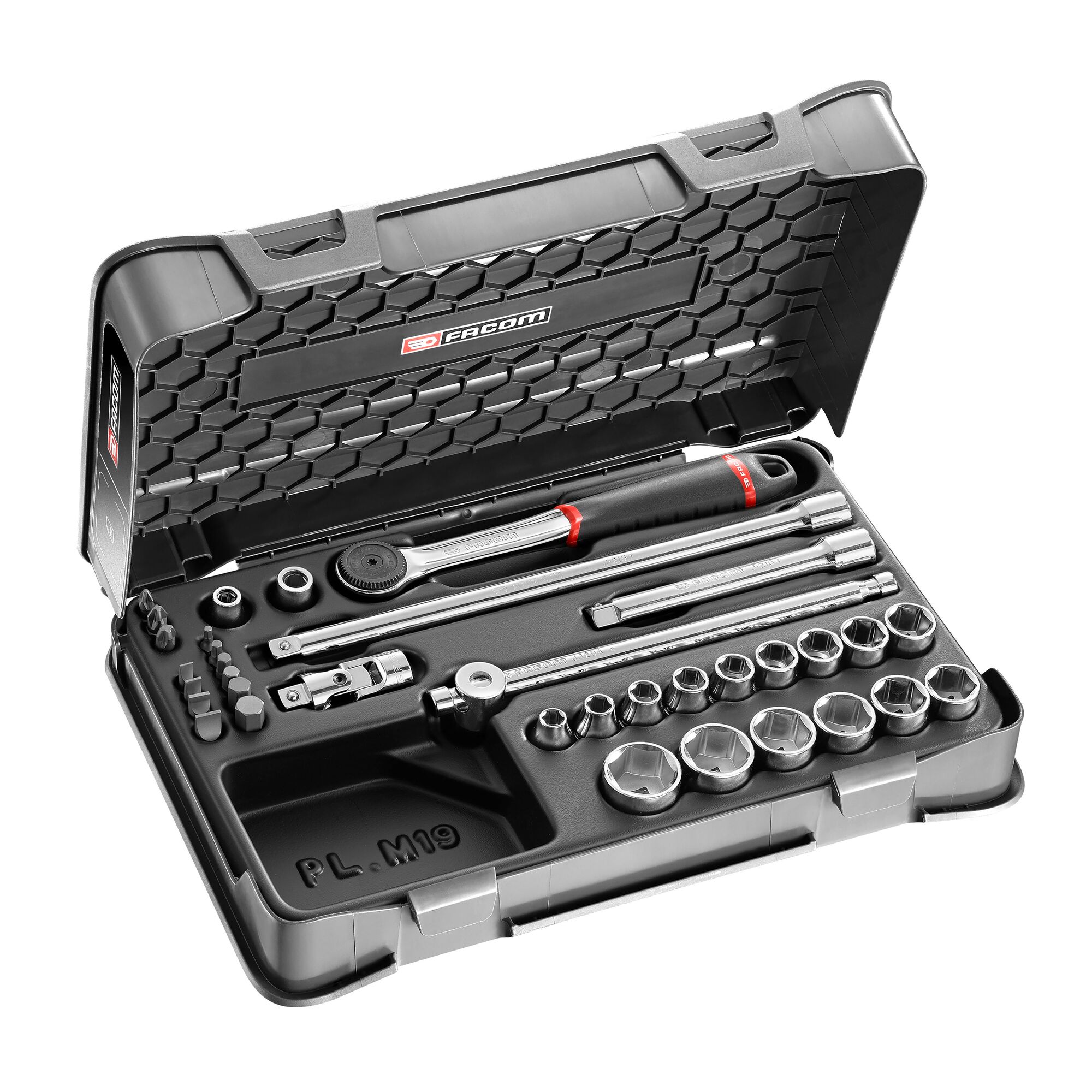 This is 3/8' SOCKET SET 6PT MM J.161B 35PC manufactured by Facom. The manufacturer part number is J.431BSP. It is available in metric package. VDE/1000V Approval Options - no. A quality product with a nice bright chrome finish. The product features a square drive. The product is made from highly stable and reliable chrome vandium steel. The socket's size is 7 , 8 , 9 , 10 , 11 , 12 , 13 , 14 , 15 , 16 , 17 , 18 , 19 , 20 , 21 , 22mm. The product has a drive size of 3/8 in. It has a model j.431bsp. Moreover, it has ratchet, sockets, extensions, joint, sliding handle, bits, bit holders set contents . The product consists of 35 pieces.