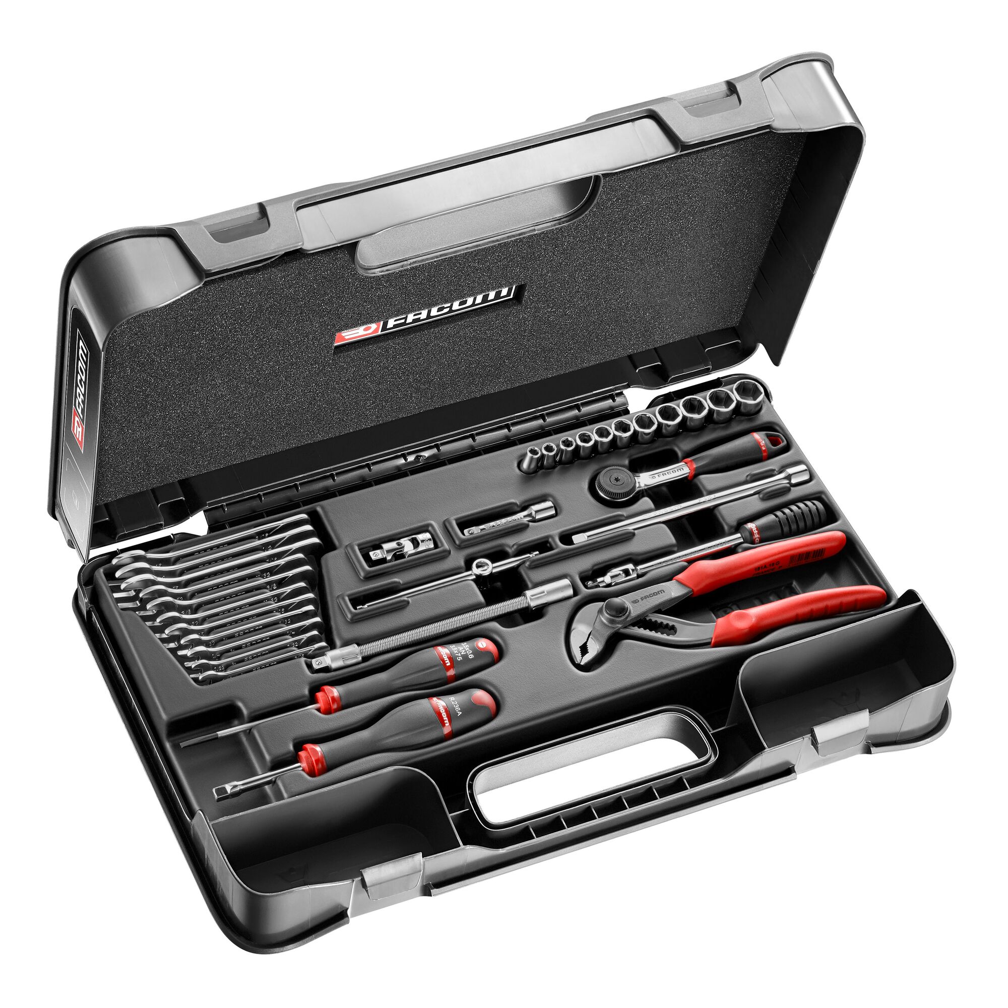 This is 1/4' SOCKET WRENCH SET IN R.161B 32PC manufactured by Facom. The manufacturer part number is R.440AUP. It is available in imperial package. VDE/1000V Approval Options - no. A quality product with a nice bright chrome finish. The product features a square drive. The product is made from highly stable and reliable chrome vandium steel. The product has a drive size of 1/4 in. It has a model r.440aup. Moreover, it has ratchet, sockets, extensions, screwdriver, multigrip plier, open end wrenches, joint, screwdriver handle, sliding handle, swivel handle set contents . The product consists of 32 pieces.