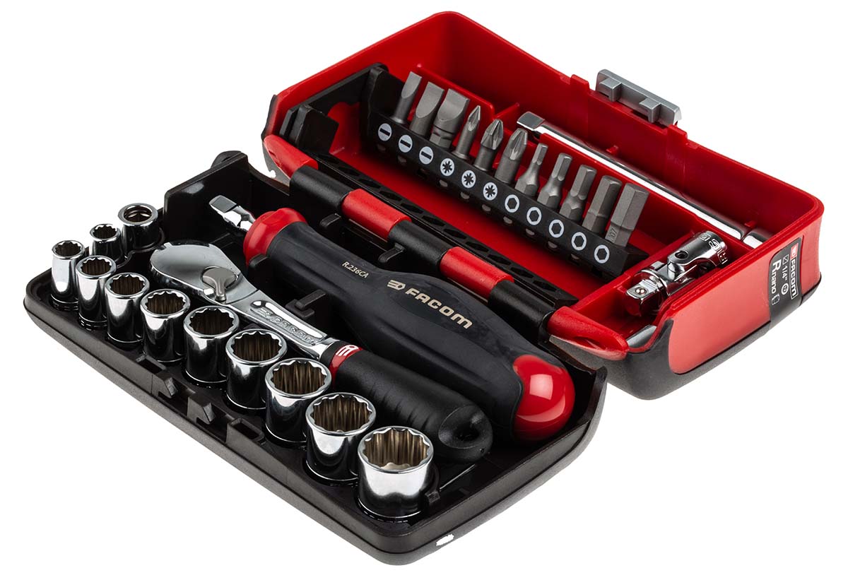 This is 25 Piece Socket Set 1/4 in 12 Point Socket Drive manufactured by Facom. The manufacturer part number is RL.NANO112. It is available in metric package. VDE/1000V Approval Options - no. A quality product with a nice bright chrome finish. The product features a square drive. The product is made from highly stable and reliable chrome vandium steel. The product has a drive size of 1/4 in. It has a model rl.nano112. Moreover, it has ratchet, sockets, extensions, joint, bit holder, shorts crewdriver handle, bits set contents . The product consists of 27 pieces.