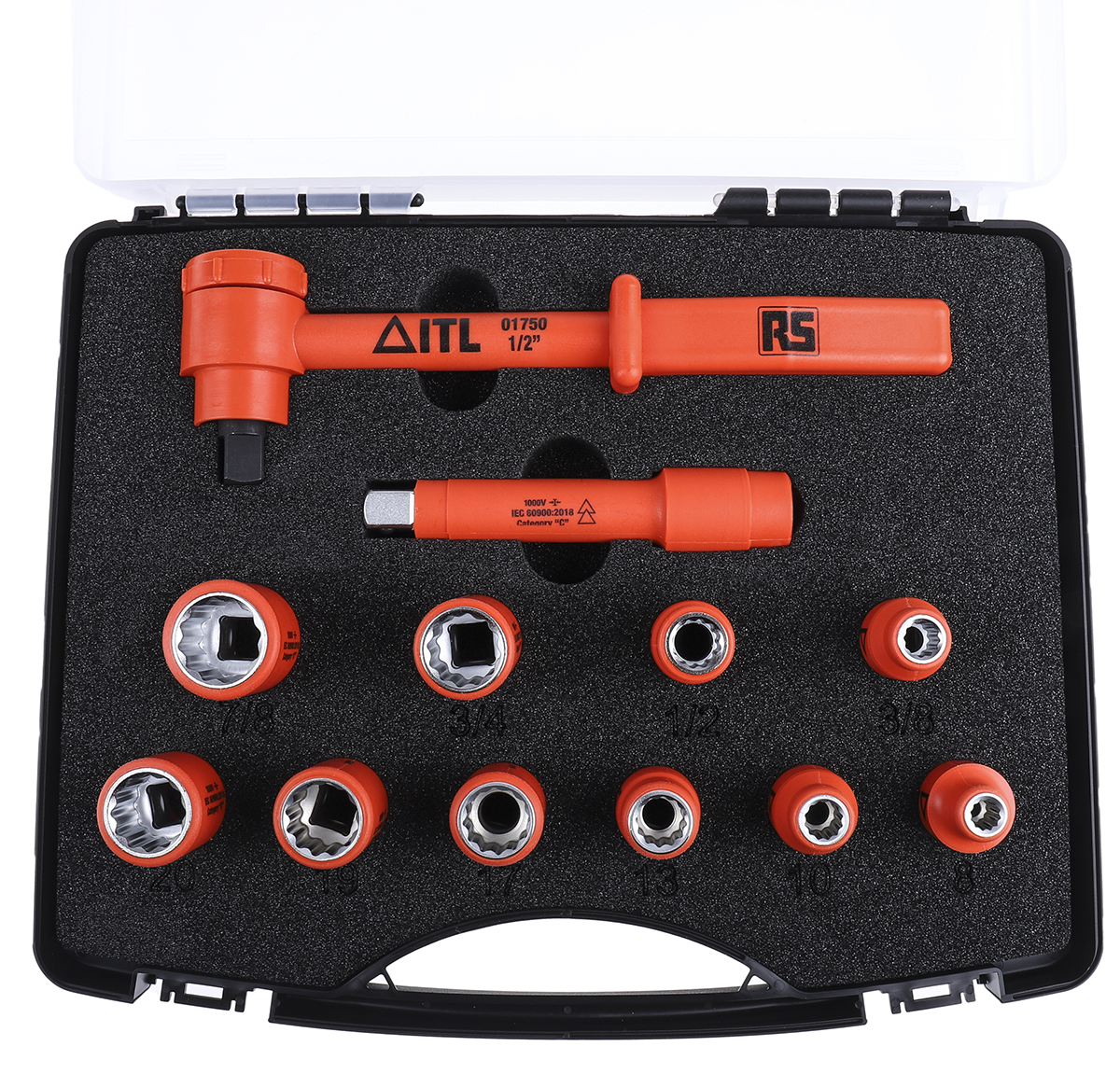 This is 12 Piece Socket Set 1/2 in Insulated Square Drive manufactured by ITL Insulated Tools Ltd. The manufacturer part number is RS_911-1477. VDE/1000V Approval Options - yes. The product is insulated yes . The 12 point socket offers profound benefits and is well-designed. The product is made from highly stable and reliable nylon 11. The product has a drive size of 1/2 in. Moreover, it has extension, ratchet, sockets set contents . socket set is a versatile product designed to provide user-defined applications. The product features a square drive. The product consists of 12 pieces.