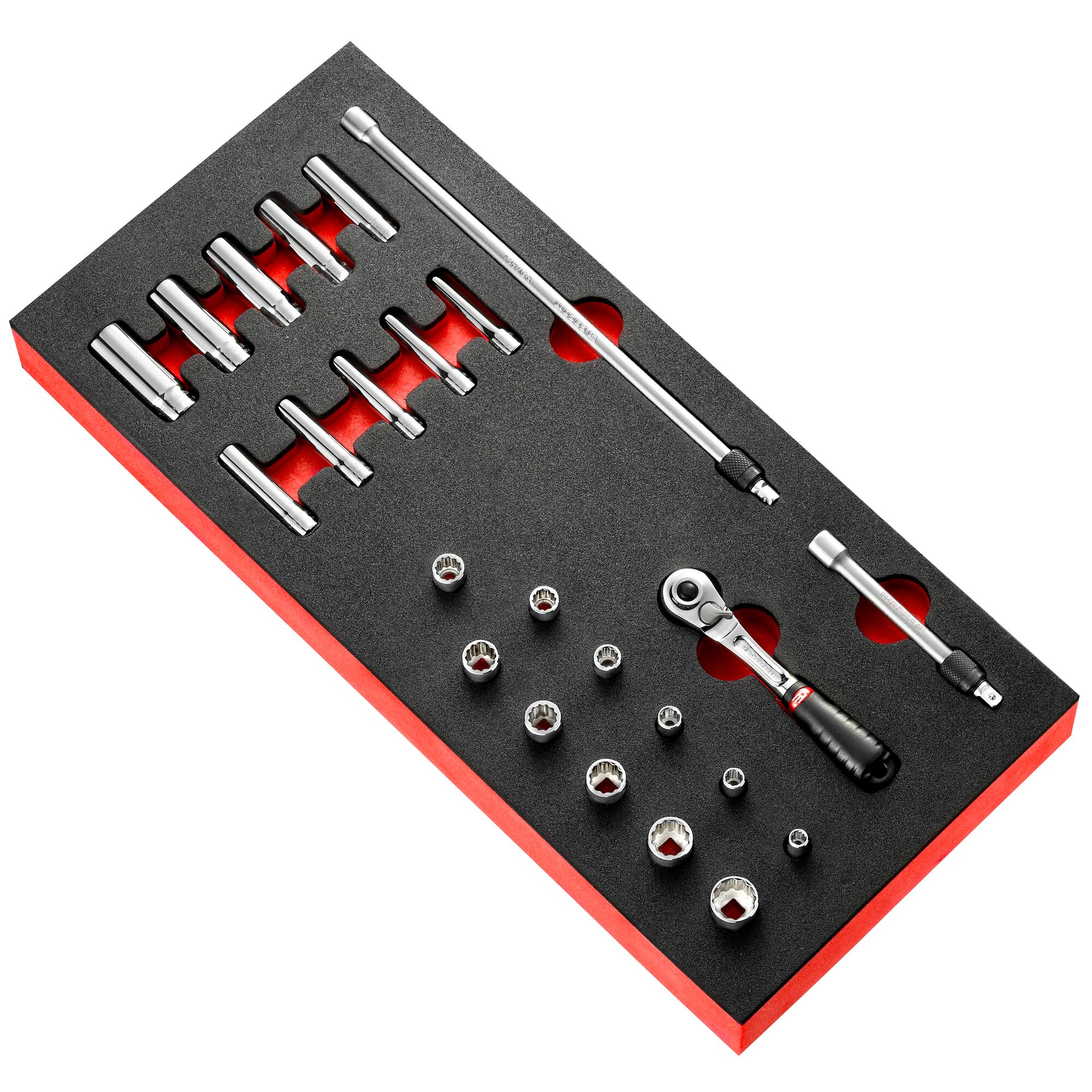 This is Locking ratchet and sockets foam module 24 Pieces manufactured by Facom. The manufacturer part number is MODM.RL1U. It is available in imperial package. VDE/1000V Approval Options - no. A quality product with a nice bright chrome finish. The product features a square drive. The product is made from highly stable and reliable chrome vandium steel. The product has a drive size of 1/4 in. It has a model modm.rl1u. Moreover, it has standard and long sockets set contents . The product consists of 24 pieces.