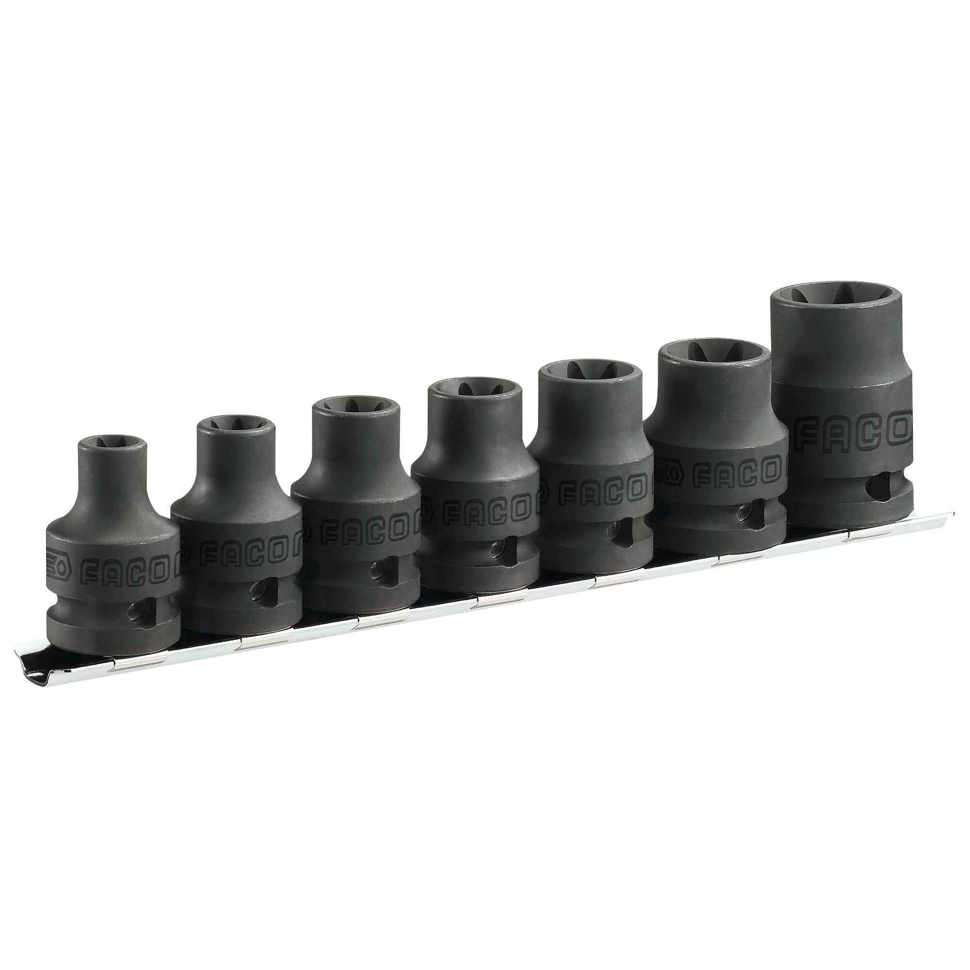 This is 7 Piece 1/2 in Socket Set manufactured by Facom. The manufacturer part number is NSTX.J7. It is available in metric package. A quality product with a nice manganese phosphate finish. The standard impact socket socket offers profound benefits and is well-designed. The product is made from highly stable and reliable chrome molybdenum steel. The socket's size is e10 , e12 , e14 , e16 , e18 , e20 , e24. The product has a drive size of 1/2 in. The product features a square drive. The product consists of 7 pieces.