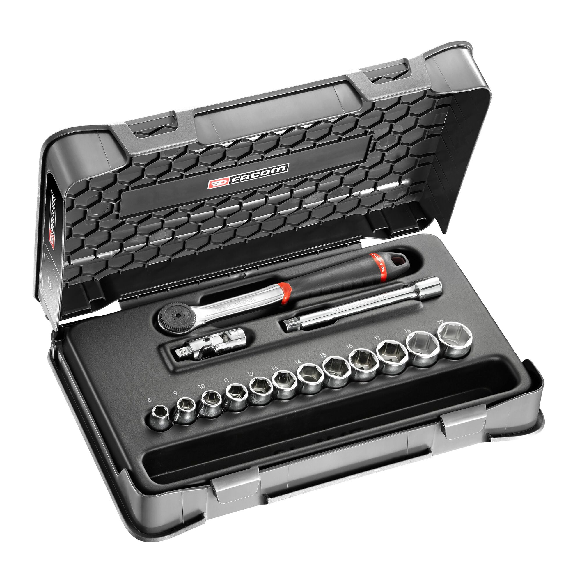 This is 15 Piece 3/8 in Socket Set manufactured by Facom. The manufacturer part number is J.161-1P6. It is available in metric package. VDE/1000V Approval Options - no. A quality product with a nice bright chrome finish. The product features a square drive. The product is made from highly stable and reliable chrome vandium steel. The socket's size is 8 , 9 , 10 , 11 , 12 , 13 , 14 , 15 , 16 , 17 , 18 , 19mm. The product has a drive size of 3/8 in. It has a model j.161-1p6. Moreover, it has ratchet, sockets, extension, joint set contents . The product consists of 15 pieces.