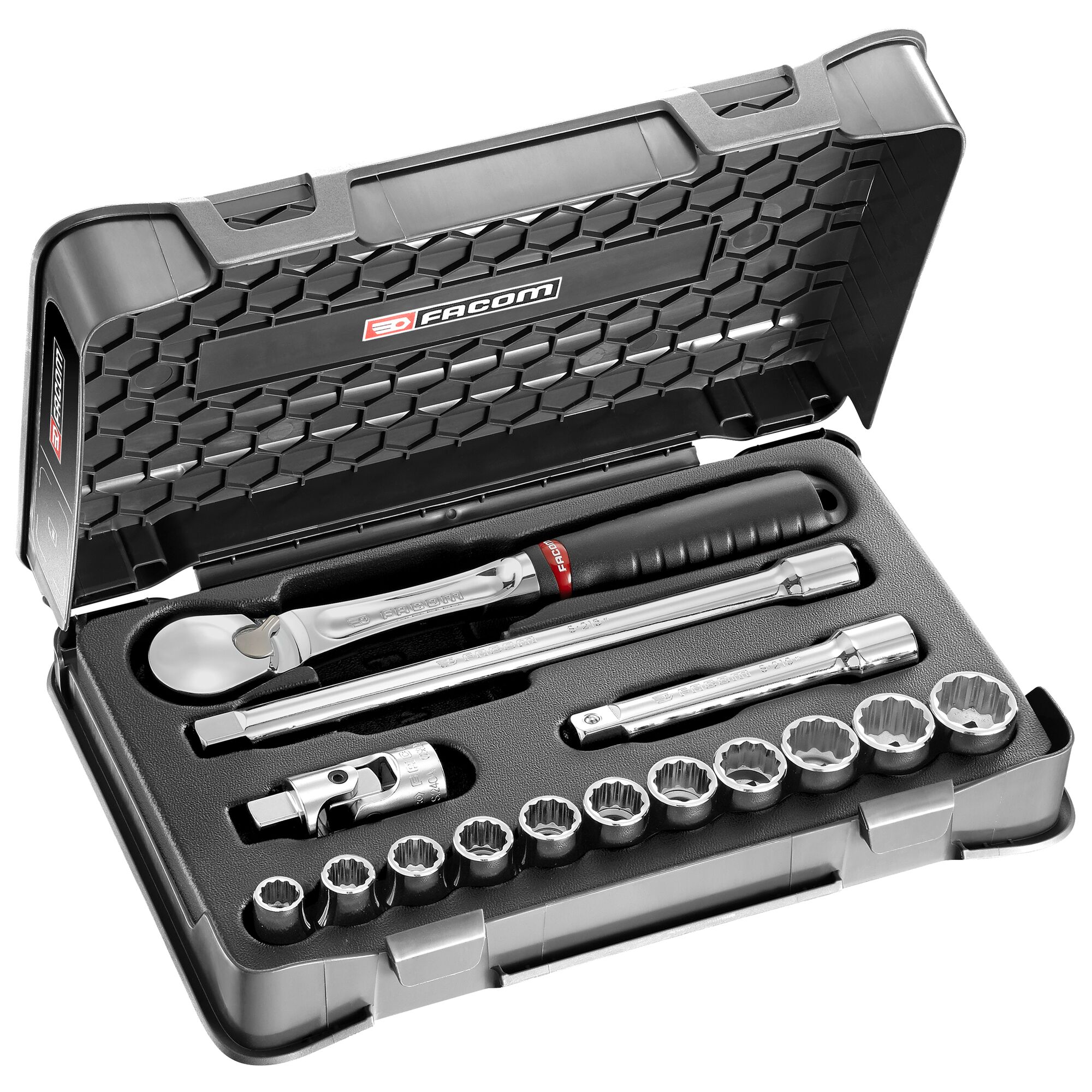 This is 15 Piece 1/2 in Socket Set manufactured by Facom. The manufacturer part number is SL.161-1P12U. VDE/1000V Approval Options - no. A quality product with a nice bright chrome finish. The 12 point socket offers profound benefits and is well-designed. The product is made from highly stable and reliable chrome vanadium steel. The socket's size is 1/2 in. It has an overall length of 330mm. The product has a drive size of 12.7 mm. Moreover, it has 2 x 1/2 in extensions, 1 x empty case, supplied with a set of pictograms to customise your box, 11 x 1/2 in drive inch 12-point sockets, 1 x high performance sealed 1/2 in ratchet, 1 x thermoformed tray set contents . socket set is a versatile product designed to provide user-defined applications. The product features a square drive. The product consists of 15 pieces.
