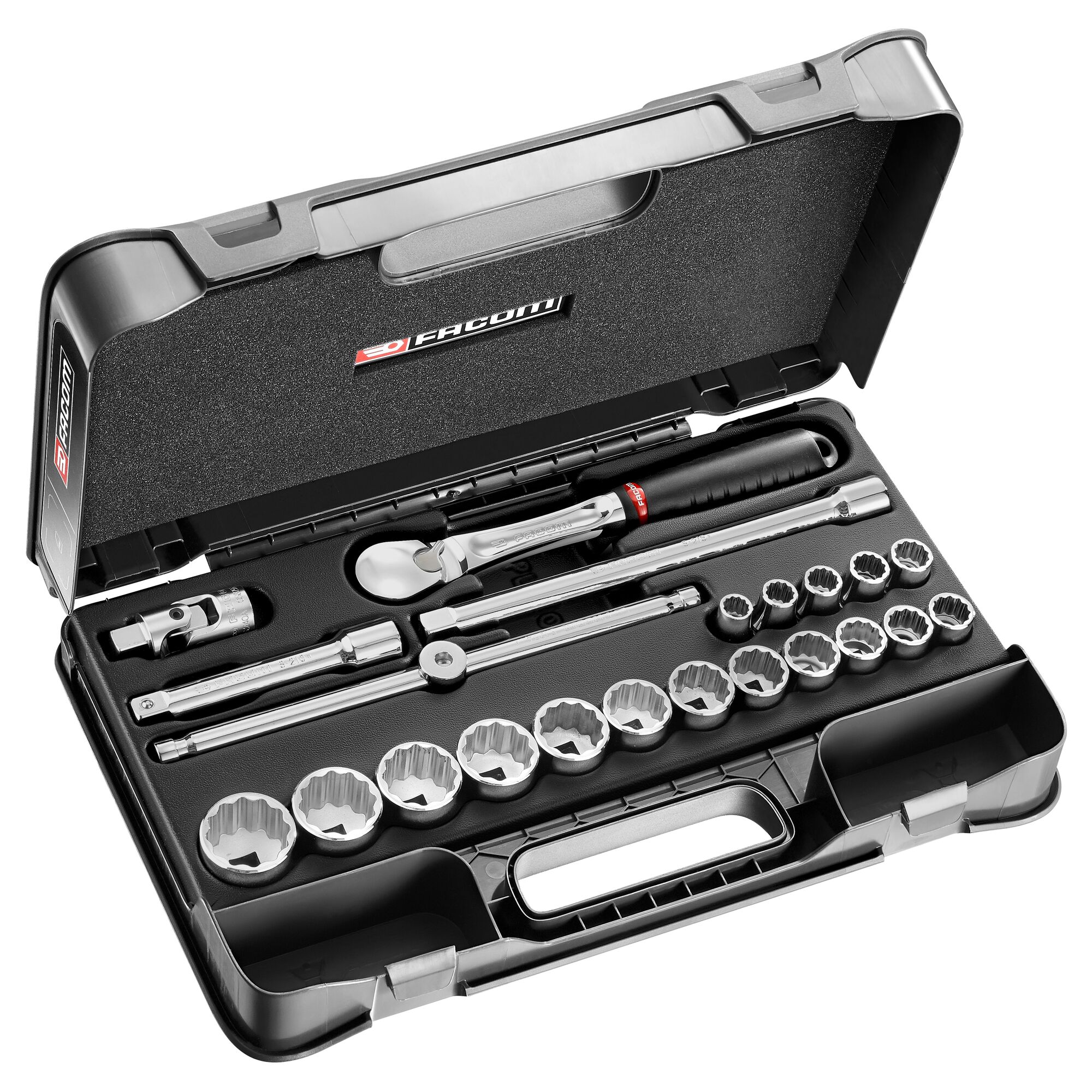 This is 22 Piece 1/2 in Socket Set manufactured by Facom. The manufacturer part number is SL.161-2P12U. It is available in imperial package. VDE/1000V Approval Options - no. A quality product with a nice bright chrome finish. The product features a square drive. The product is made from highly stable and reliable chrome vandium steel. The socket's size is 3/8" , 7/16" , 1/2" , 9/16" , 19/32" , 5/8" , 21/32" , 11/16" , 3/4" , 13/16" , 7/8" , 15/16" , 1" , 1"1/16 , 1"1/8 , 1"3/16 , 1"1/4. The product has a drive size of 1/2 in. It has a model sl.161-2p12u. Moreover, it has ratchet, sockets, extensions, joint, sliding handle set contents . The product consists of 22 pieces.