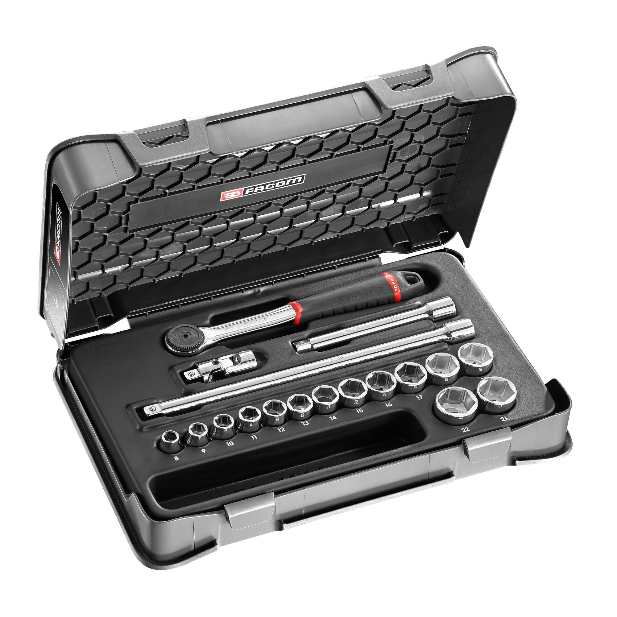 This is 18 Piece 3/8 in Socket Set manufactured by Facom. The manufacturer part number is J.161-2P6PF. It is available in metric package. VDE/1000V Approval Options - no. A quality product with a nice bright chrome finish. The product features a square drive. The product is made from highly stable and reliable chrome vandium steel. The socket's size is 8 , 9 , 10 , 11 , 12 , 13 , 14 , 15 , 16 , 17 , 18 , 19 , 21 , 22mm. The product has a drive size of 3/8 in. It has a model j.161-2p6pf. Moreover, it has ratchet, sockets, extension, joint set contents . The product consists of 18 pieces.