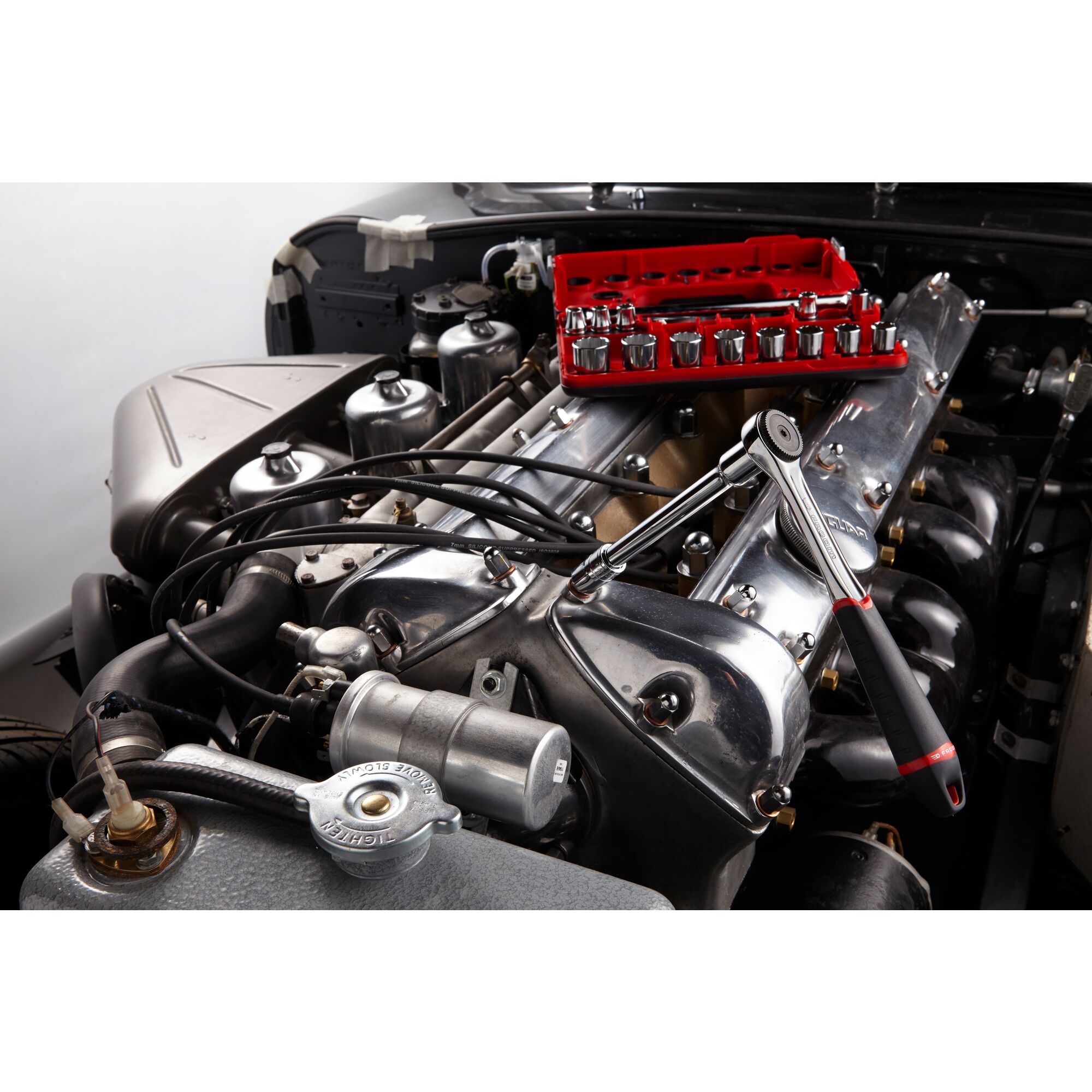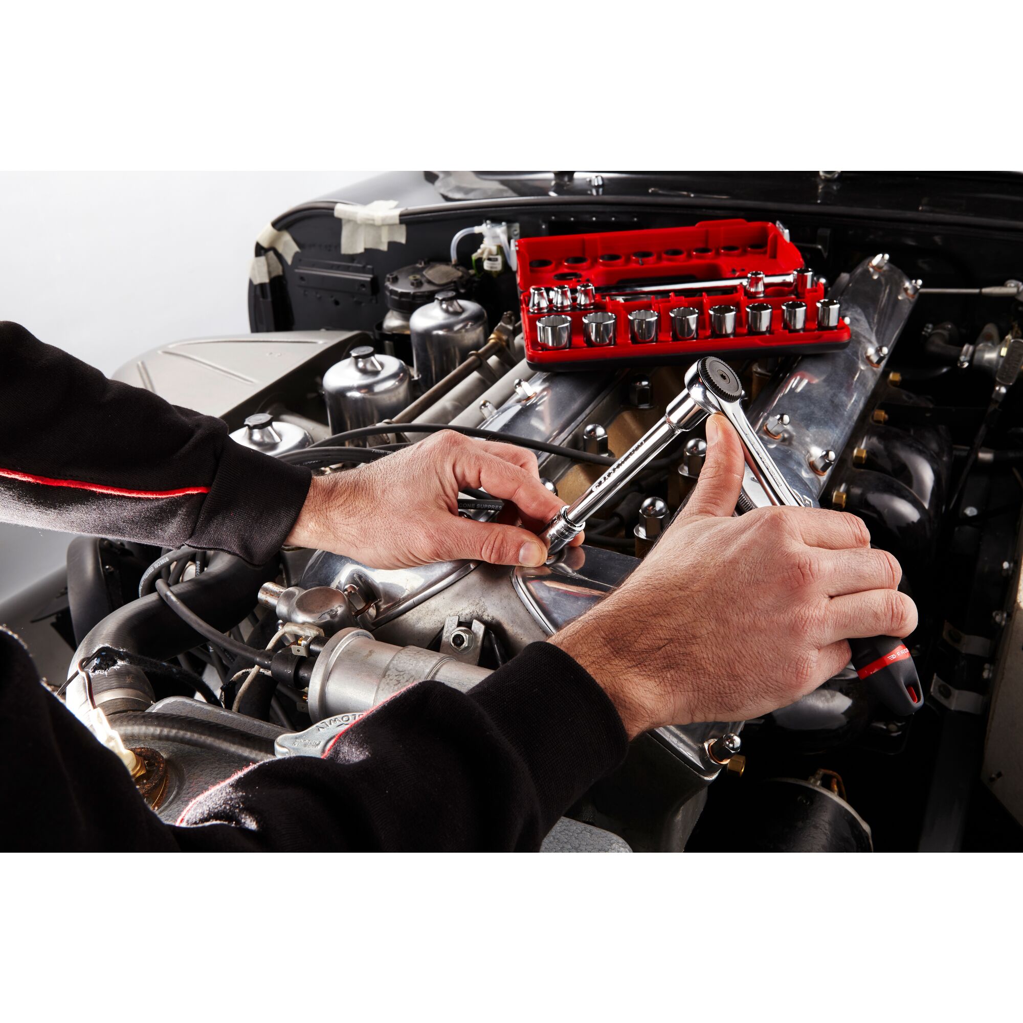 This is 18 Piece 3/8 in Socket Set manufactured by Facom. The manufacturer part number is J.161DBOX1. It is available in metric package. VDE/1000V Approval Options - no. A quality product with a nice bright chrome finish. The product features a square drive. The product is made from highly stable and reliable chrome vandium steel. The socket's size is 8 , 9 , 10 , 11 , 12 , 13 , 14 , 15 , 16 , 17 , 18 , 19 , 21 , 22mm. The product has a drive size of 3/8 in. It has a model j.161dbox1. Moreover, it has ratchet, sockets set contents . The product consists of 18 pieces.