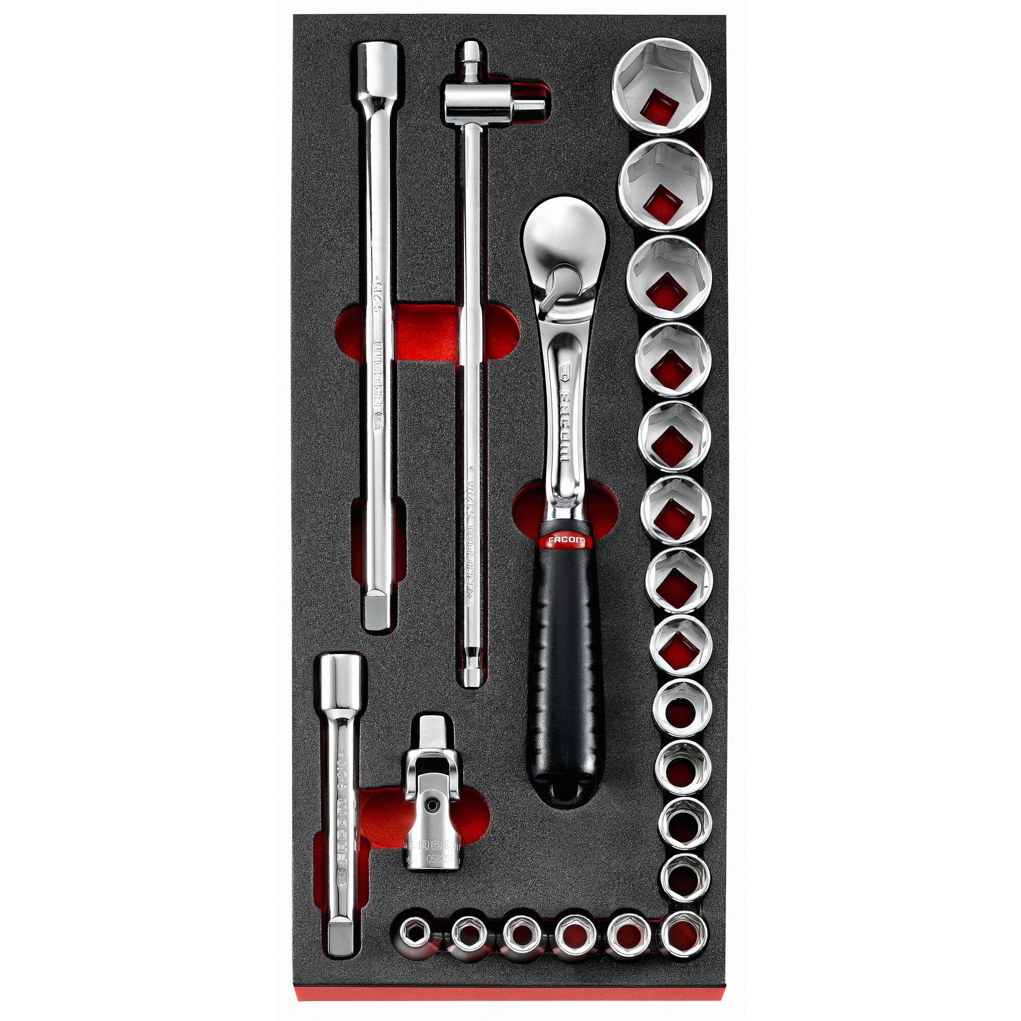 This is 1/2 in Socket Set manufactured by Facom. The manufacturer part number is MODM.SL1PB. It is available in metric package. VDE/1000V Approval Options - no. A quality product with a nice bright chrome finish. The product features a square drive. The product is made from highly stable and reliable chrome vandium steel. The socket's size is 8 , 9 , 10 , 11 , 12 , 13 , 14 , 15 , 16 , 17 , 18 , 19 , 21 , 22 , 23 , 24 , 27 , 30 , 32mm. The product has a drive size of 1/2 in. It has a model modm.sl1pb. Moreover, it has ratchet, sockets, extensions, sliding handle, joint set contents . The product consists of 23 pieces.