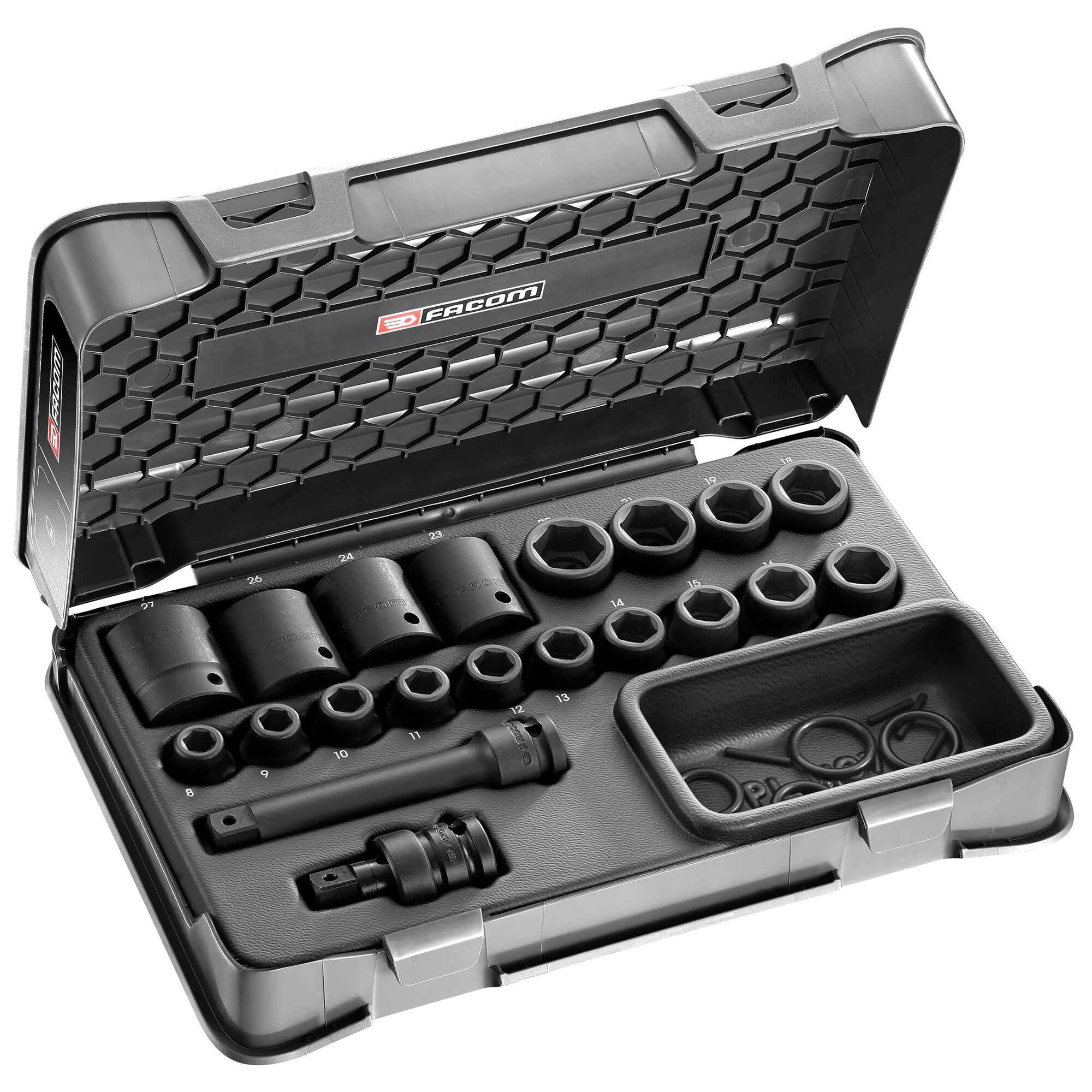 This is 20 Piece 1/2 in Socket Set manufactured by Facom. The manufacturer part number is NS.500B. It is available in metric package. A quality product with a nice manganese phosphate finish. The standard impact socket socket offers profound benefits and is well-designed. The product is made from highly stable and reliable chrome molybdenum steel. The socket's size is 8 > 27mm. The product has a drive size of 1/2 in. The product features a square drive. The product consists of 20 pieces.
