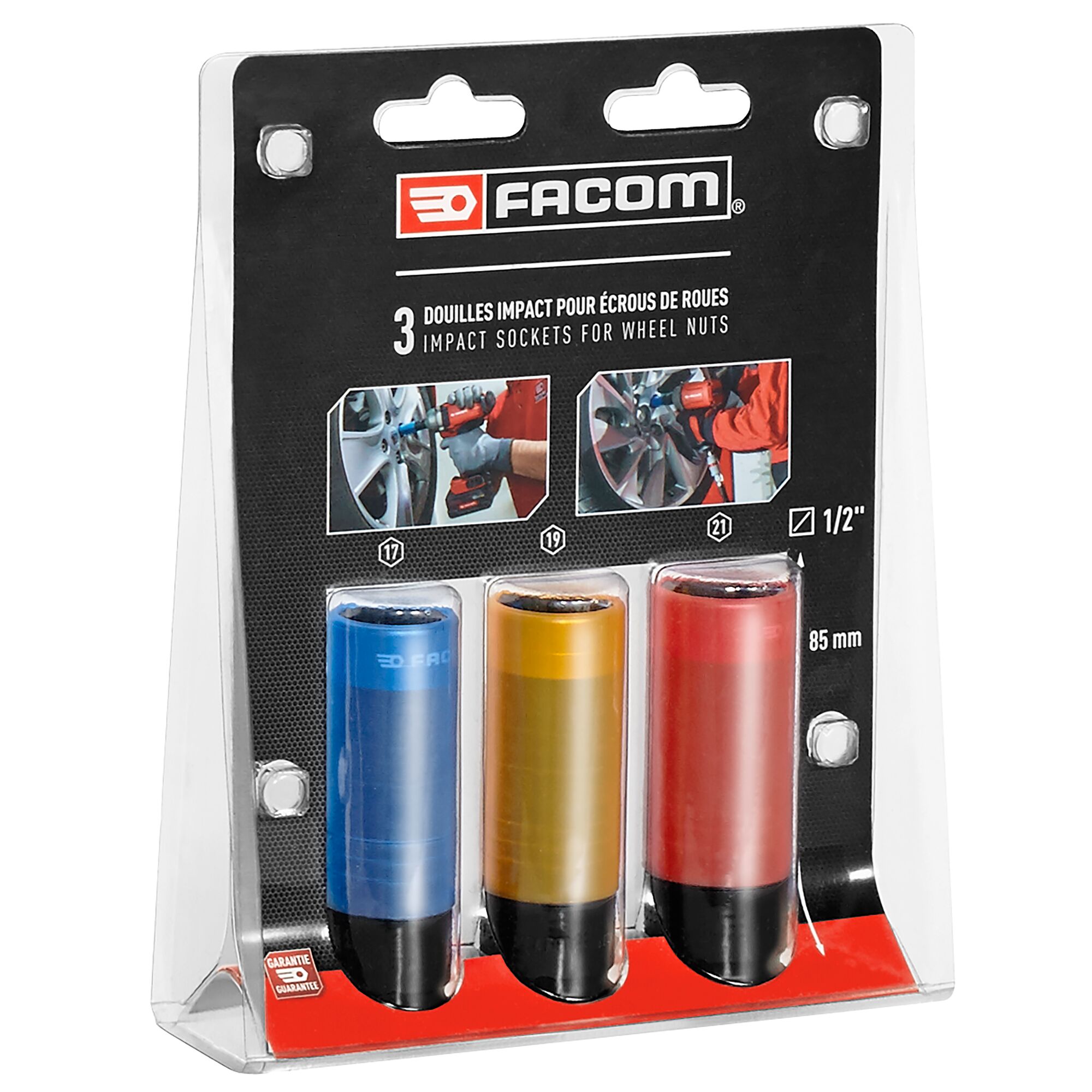 This is 3 Piece 1/2 in Socket Set manufactured by Facom. The manufacturer part number is NSI.3LPB. It is available in metric package. VDE/1000V Approval Options - no. The product features a square drive. The product is made from highly stable and reliable chrome molybdenum steel. The socket's size is 17 , 19 , 21mm. The product has a drive size of 1/2 in. It has a model nsi.3lpb. Moreover, it has long impact sockets set contents . The product consists of 3 pieces.