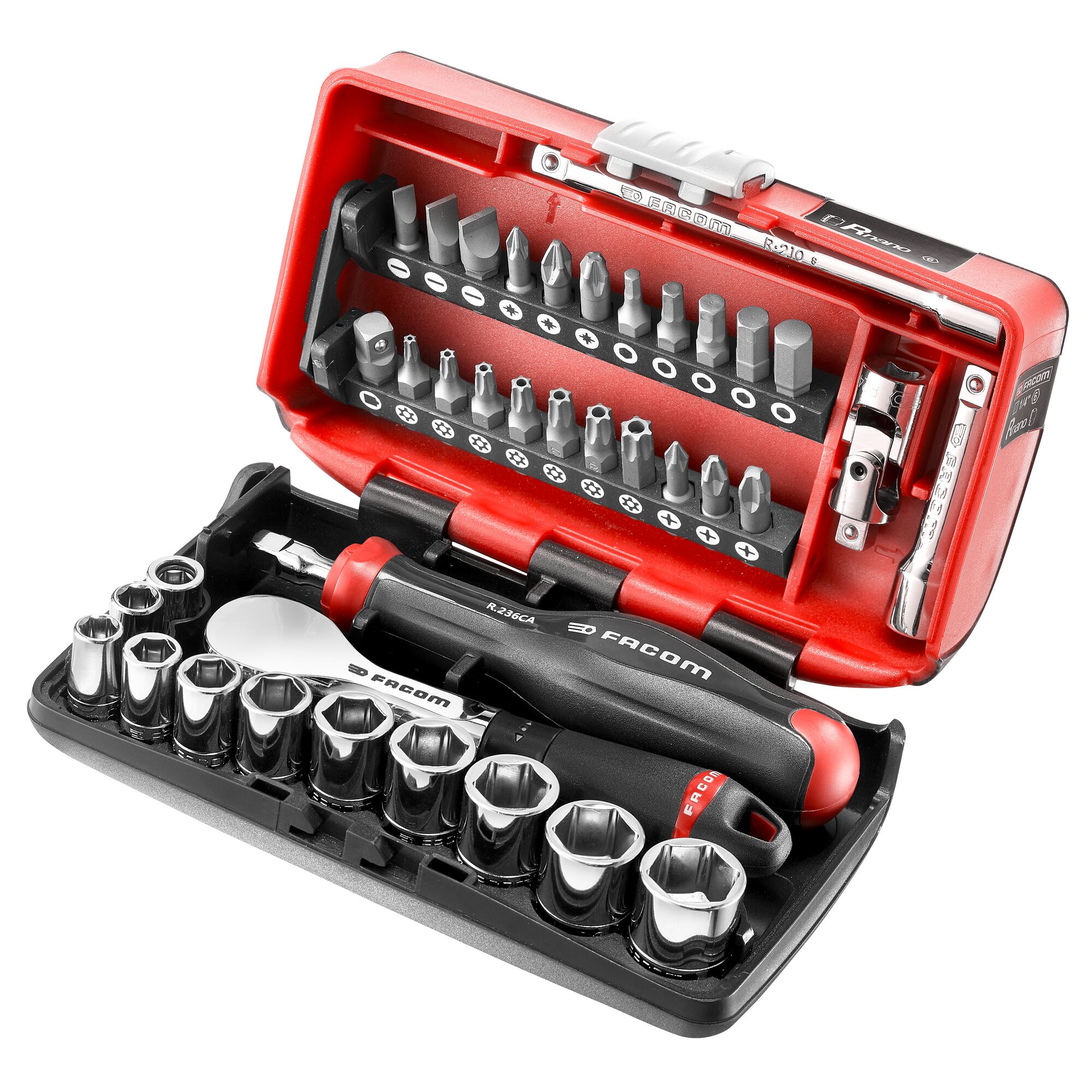 This is 38 Piece 1/4 in Socket Set manufactured by Facom. The manufacturer part number is R.181NANO. It is available in metric package. VDE/1000V Approval Options - no. A quality product with a nice bright chrome finish. The product features a square drive. The product is made from highly stable and reliable chrome vandium steel. The product has a drive size of 1/4 in. It has a model r.181nano. Moreover, it has ratchet, sockets, extensions, joint, bit holder, screwdriver handle, bits set contents . The product consists of 38 pieces.