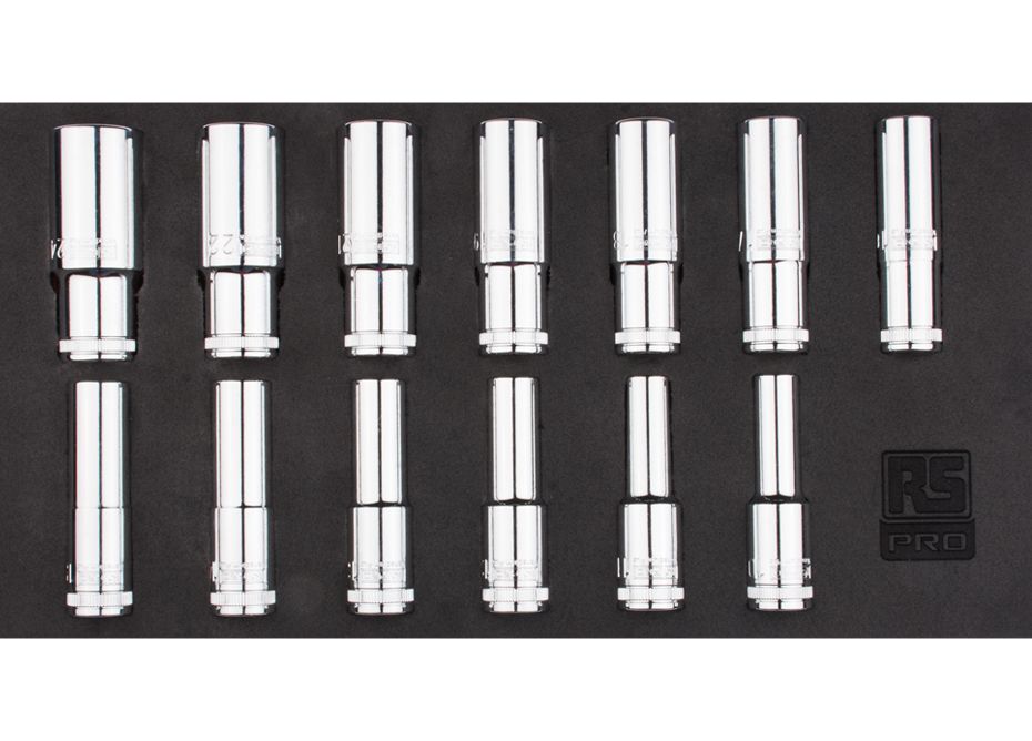 This is 13 Piece 1/2 in Deep Socket Set manufactured by RS PRO. The manufacturer part number is 249-0349. It is available in metric package. A quality product with a nice chrome finish. The product features a square drive. The product is made from highly stable and reliable chrome vanadium steel. The socket's size is 10 → 24mm. The product has a drive size of 1/2 in. The product consists of 13 pieces.