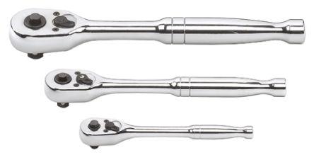 This is 1/2 in 1/4 in 3/8 in Socket Wrench with Quick Release Handle manufactured by Gear Wrench. The manufacturer part number is 81310. The product has a drive size of 1/2 in, 1/4 in, 3/8 in. A quality product with a nice chrome finish. The product is made from highly stable and reliable alloy steel. Basically, this handle is a type of quick release, allowing extreme comfort.
