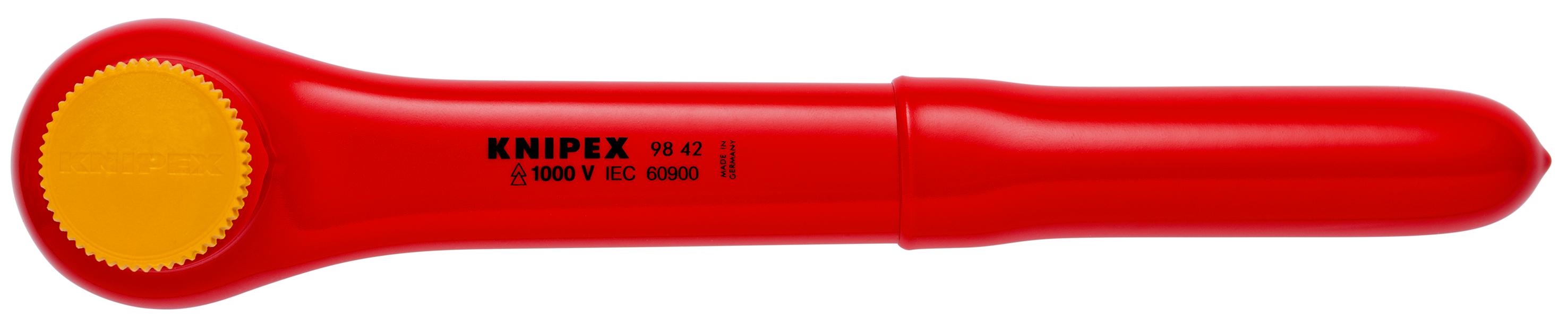 This is 1/2 in Square Ratchet with Reversible Ratchet Handle 265 mm Overall manufactured by Knipex. The manufacturer part number is 98 42. The product has a drive size of 1/2 in. Its driver is of a/an square shape . Basically, this handle is a type of reversible ratchet, allowing extreme comfort. It has an overall length of 265 mm.