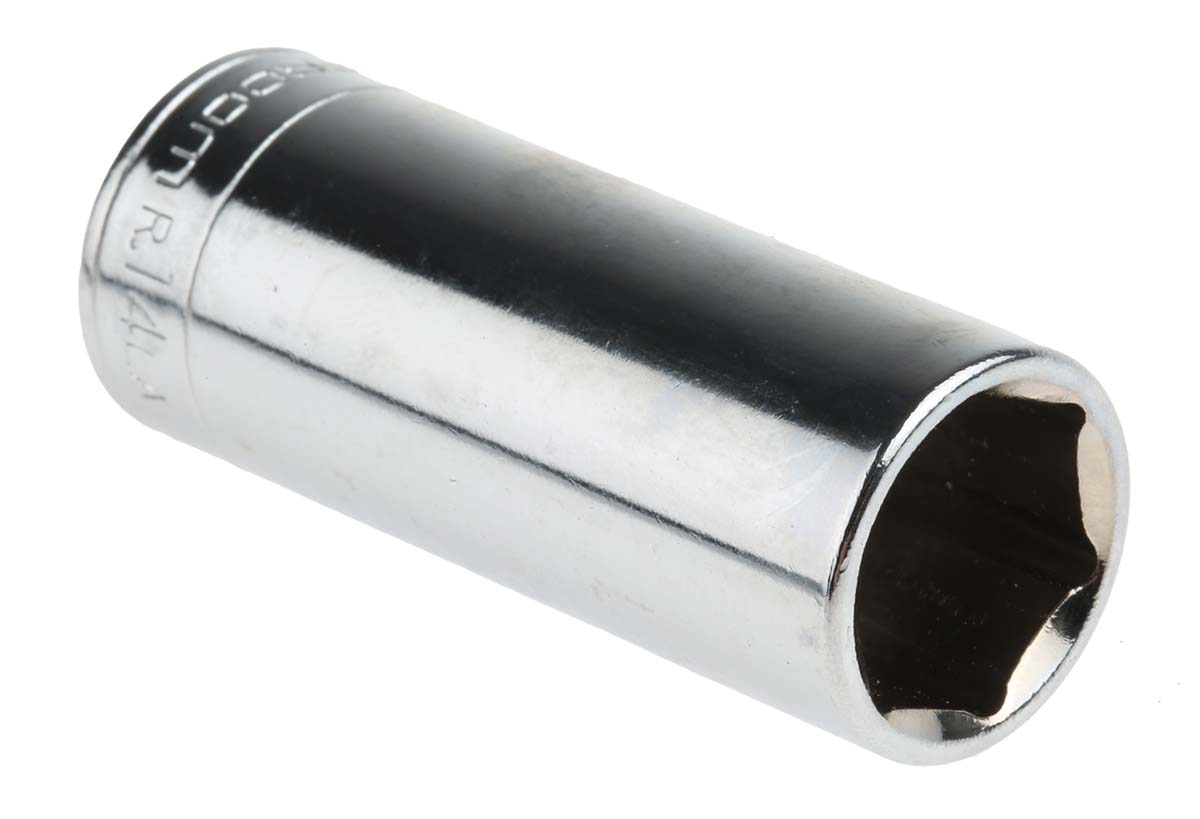 This is 14mm with 1/4 in Drive Socket Hex; Deep 50.5 mm manufactured by Facom. The manufacturer part number is R.14LA. It is available in metric package. VDE/1000V Approval Options - no. It has a non sparking nature no . A quality product with a nice chrome finish. The product features a square drive. The product is made from highly stable and reliable chrome vanadium steel. It has an overall length of 50.5 mm. The socket's size is 14mm. The product has a drive size of 1/4 in. Its bit is about 10.2mm in length . It has a model r.14la. The long socket socket offers profound benefits and is well-designed.