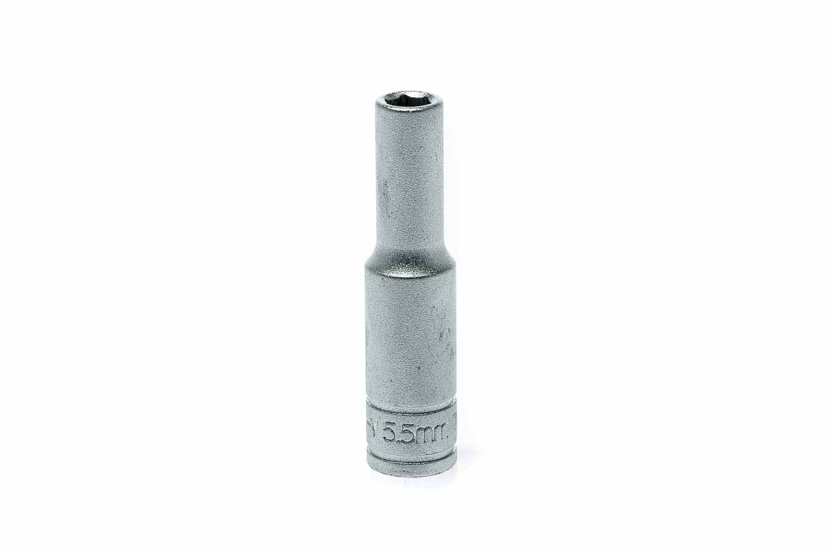 This is 5.5mm Deep Socket With 6.35 mm Drive Length 49.5 mm manufactured by Teng Tools. The manufacturer part number is M1406055-C. It is available in metric package. The deep socket socket offers profound benefits and is well-designed. The socket's size is 5.5mm. It has an overall length of 49.5 mm. The product has a drive size of 1/4 in.