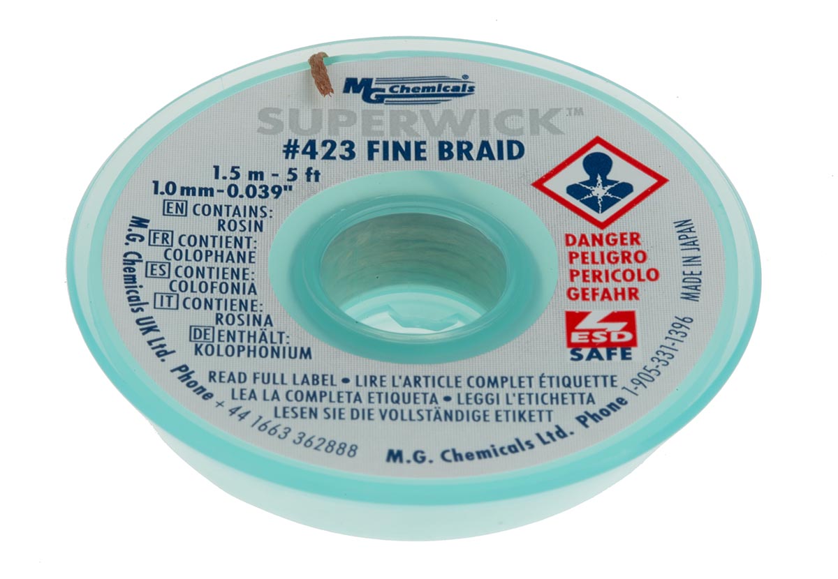 This is 1.5m Desoldering Braid Width 1mm manufactured by Super Wick. The manufacturer part number is 423. Furthermore, the product is 1mm wide. Its accurate length is 1.5m. It has a model number superwick 423.