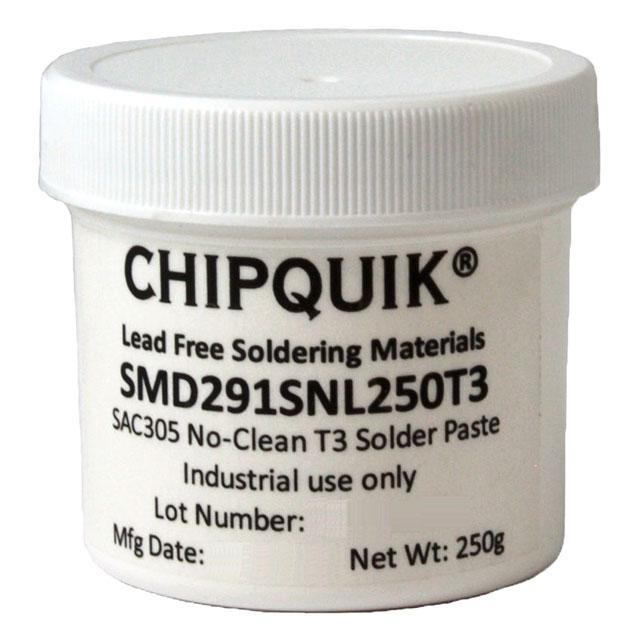 This is manufactured by Chip Quik Inc.. The manufacturer part number is SMD291SNL250T3. It is assigned with possible HTSUS value of 8311.30.6000. The product is rohs3 compliant. The product is highly reliable with a long-lasting period of 6 months. It comes in solder paste configuration. It is composed of sn96.5ag3cu0.5 (96.5/3/0.5). It has a melting point of 423 ~ 428°f (217 ~ 220°c). The product is designed as a nice jar, 8.8 oz (250g). In addition, it is reach unaffected. Its warranty starts from date of manufacture. It offers storage features at 37°f ~ 46°f (3°c ~ 8°c). The chip quik inc.'s product offers user-desired applications. Its typical moisture sensitivity level is not applicable. It has a long 10 weeks standard lead time. Shipping Information: ships with cold pack. to ensure customer satisfaction and product integrity, air shipment is recommended.. Storage Options - refrigerated . The typical product's weight is 0.551 lb (249.93 g). It is a lead free process. It is a no-clean flux. In addition, bulk is the available packaging type of the product. The mesh is a 3 type of mesh. Moreover, it corresponds to smd291, a base product number of the product. The product is designated with the ear99 code number.