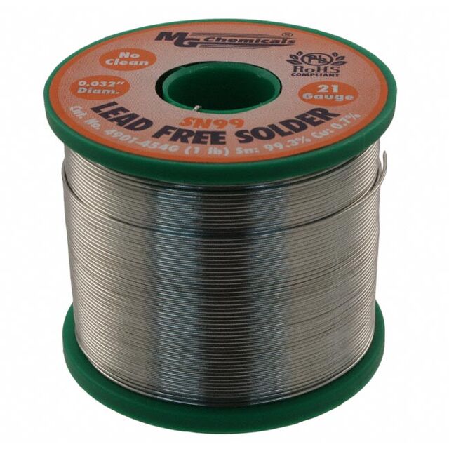 This is manufactured by MG Chemicals. The manufacturer part number is 4901-454G. It includes 0% silver . The product is in wire form . It has a model number 4901-454g. The wire has 0.81mm diameter. It is assigned with possible HTSUS value of 8311.30.6000. The product is rohs3 compliant. The product is highly reliable with a long-lasting period of 60 months. It comes in wire solder configuration. It is composed of sn99.3cu0.7 (99.3/0.7). It has a melting point of 442°f (227°c). The product is designed as a nice spool, 1 lb (454 g). In addition, it is reach unaffected. Its warranty starts from date of manufacture. It offers storage features at 50°f ~ 86°f (10°c ~ 30°c). The mg chemicals's product offers user-desired applications. Moreover, the product has a wire gauge of 20 awg, 21 swg. Its typical moisture sensitivity level is not applicable. It has a long 2 weeks standard lead time. Its diameter is 0.032" (0.81mm). The typical product's weight is 1 lb (453.59 g). It is a lead free process. The product 4901, is a highly preferred choice for users. It is a no-clean flux. In addition, spool is the available packaging type of the product. Moreover, it corresponds to 4901, a base product number of the product. The product is designated with the ear99 code number.