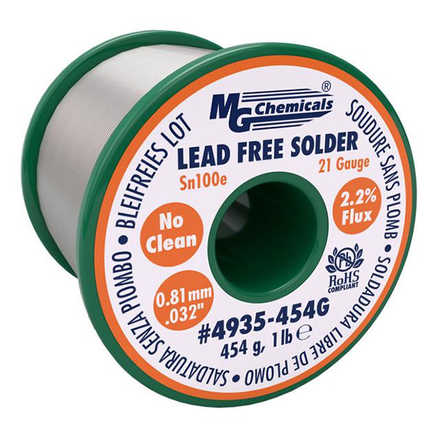 This is manufactured by MG Chemicals. The manufacturer part number is 4935-454G. It is assigned with possible HTSUS value of 8311.30.6000. The product is rohs3 compliant. The product is highly reliable with a long-lasting period of 60 months. It comes in wire solder configuration. It is composed of sn99.5cu0.5 (99.5/0.5). It has a melting point of 442°f (228°c). The product is designed as a nice spool, 1 lb (454 g). In addition, it is reach unaffected. Its warranty starts from date of manufacture. It offers storage features at 65°f ~ 80°f (18°c ~ 27°c). The mg chemicals's product offers user-desired applications. Moreover, the product has a wire gauge of 20 awg, 21 swg. Its typical moisture sensitivity level is not applicable. Its diameter is 0.032" (0.81mm). It is a lead free process. The product 4935, is a highly preferred choice for users. It is a no-clean flux. In addition, spool is the available packaging type of the product. The product is designated with the ear99 code number.