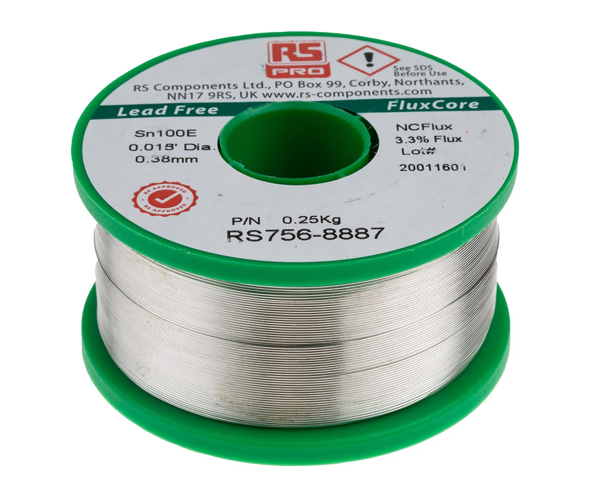 This is 0.4mm Wire Lead Free Solder +228°C Melting Point 0.5% Copper 99.5% Tin 250g manufactured by RS Pro. The manufacturer part number is 756-8887. It has 99.5% tin . It is made using 0% lead . It has a melting point of 228°c. The product is in wire form . It includes 0.5% of copper . The wire has 0.38mm diameter. It has a model number nc600 sn100e. It is a rosin based flux. Its flux content is about 3.3% . The overall weight of the product is about 250g .