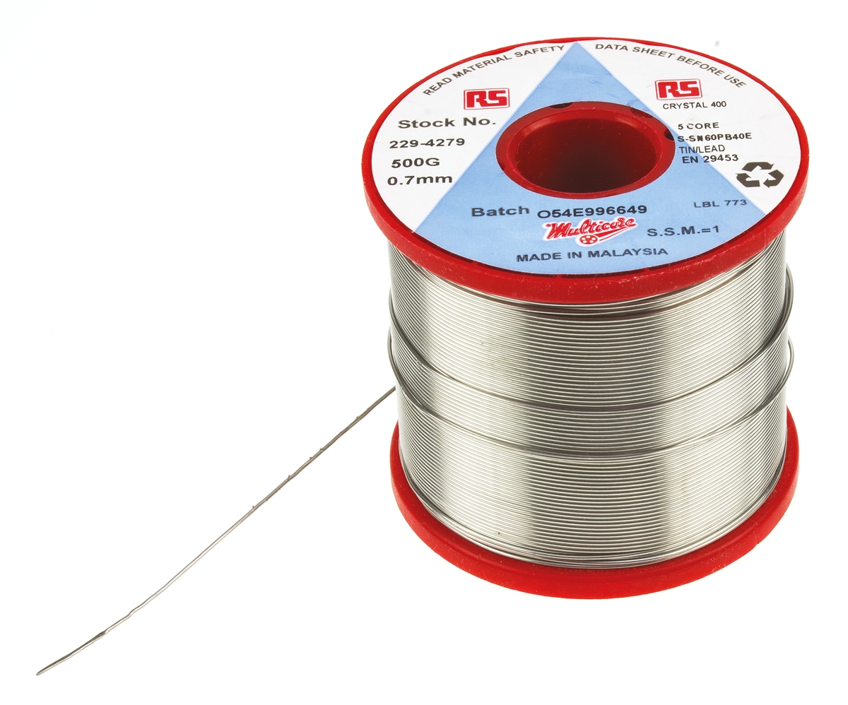 This is 0.7mm Wire Lead solder 183 → 188°C Melting Point 40% Lead 60% Tin 500g manufactured by Multicore. The manufacturer part number is 291319. It has 60% tin . It is made using 40% lead . It has a melting point of 183 → 188°c. The product is in wire form . The wire has 0.7mm diameter. It has a model number c400. It is a activated rosin flux. Its flux content is about 2.2% . The overall weight of the product is about 500g .