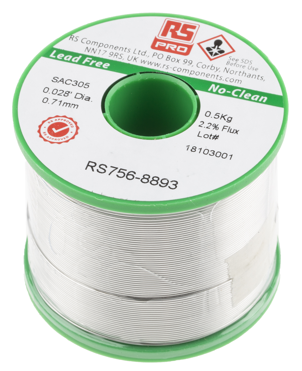This is 0.71mm Wire Lead Free Solder +217 → +221°C Melting Point 0.5% Copper 96.5% Tin 3.0% Silver 500g manufactured by RS Pro. The manufacturer part number is 756-8893. It has 96.5% tin . It is made using 0% lead . It has a melting point of 217°c. The product is in wire form . It includes 0.5% of copper . The wire has 0.71mm diameter. It has a model number sac305 nc600. It is a rosin based flux. It includes 3% silver . Its flux content is about 2.2% . The overall weight of the product is about 500g .