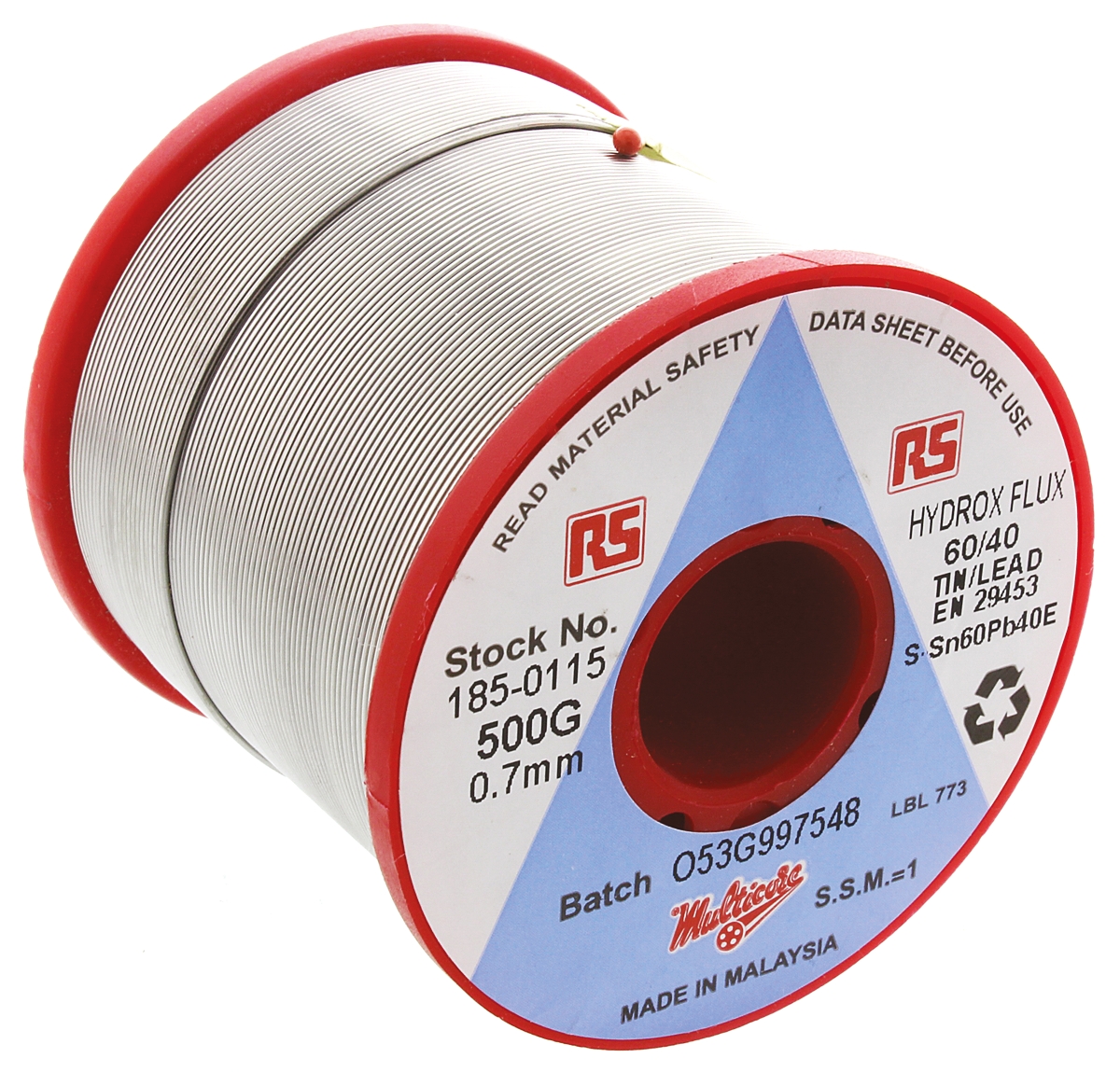 This is 0.71mm Wire Lead solder +183 → +188°C Melting Point 40% Lead 60% Tin 500g manufactured by Multicore. The manufacturer part number is 288850. It has 60% tin . It is made using 40% lead . It has a melting point of 183 → 188°c. The product is in wire form . The wire has 0.7mm diameter. It has a model number hydro-x. It is a halogen free flux. Its flux content is about 2% . The overall weight of the product is about 500g .