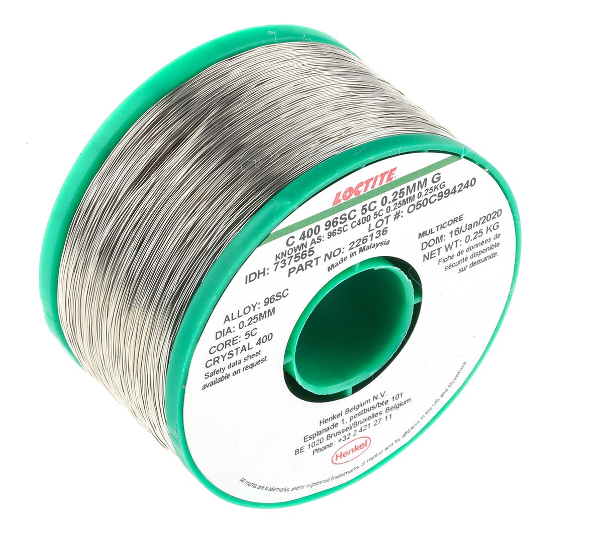 This is 0.25mm Wire Lead Free Solder +217°C Melting Point 0.7% Copper 95.5% Tin 3.5% Silver 250g manufactured by Multicore. The manufacturer part number is 737565. It has 95.5% tin . It is made using 0% lead . It has a melting point of 217°c. The product is in wire form . It includes 0.7% of copper . The wire has 0.25mm diameter. It has a model number c400. It is a activated rosin flux. It includes 3.8% silver . Its flux content is about 3% . The overall weight of the product is about 250g .