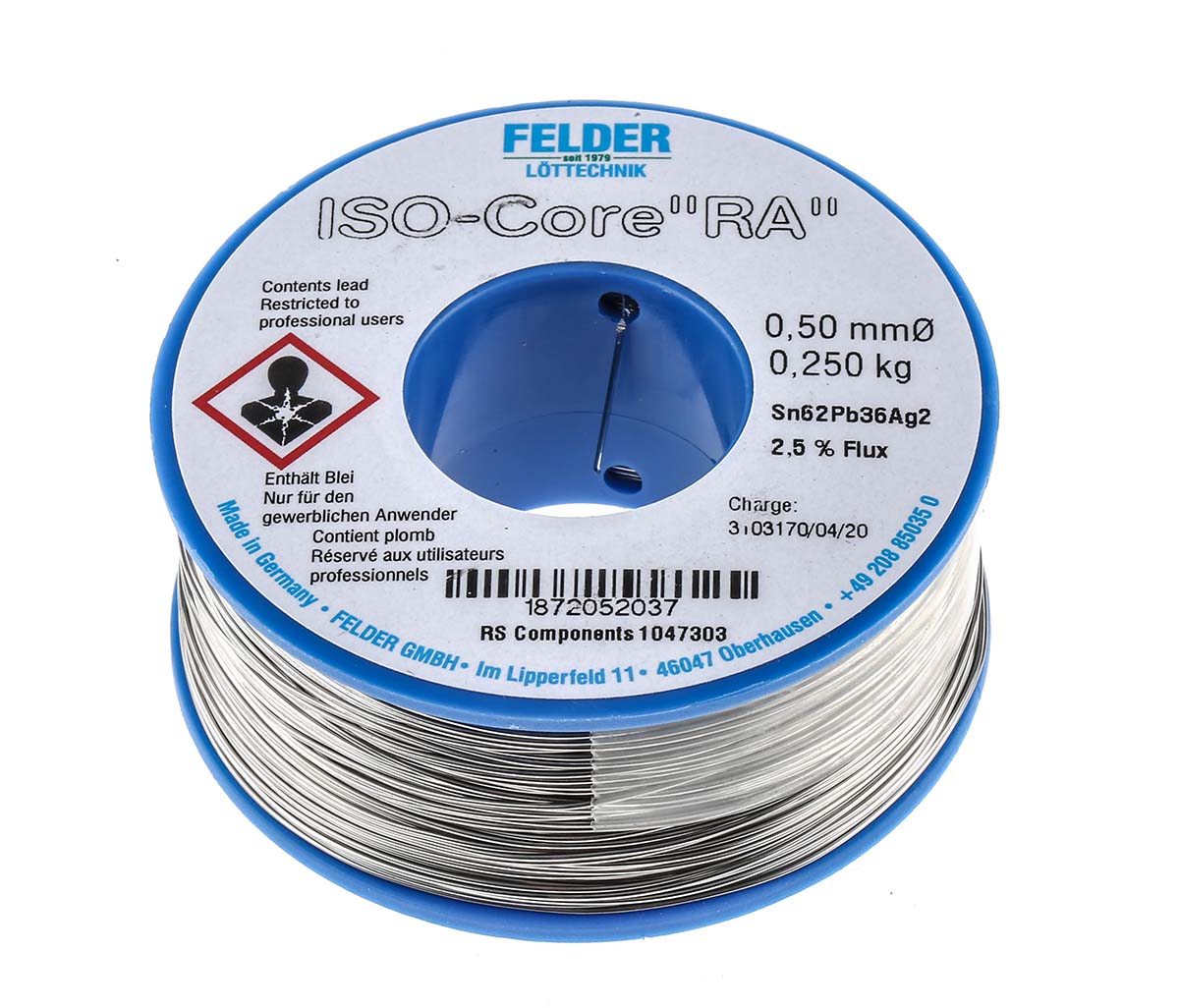 This is 0.5mm Wire Lead solder +179°C Melting Point manufactured by Felder Lottechnik. The manufacturer part number is 18.720.52037. It has 62% tin . It is made using 36% lead . It has a melting point of 179°c. The product is in wire form . The wire has 0.5mm diameter. It has a model number iso-core ra. It is a rosin based flux. It includes 2% silver . Its flux content is about 2.5% . The overall weight of the product is about 250g .