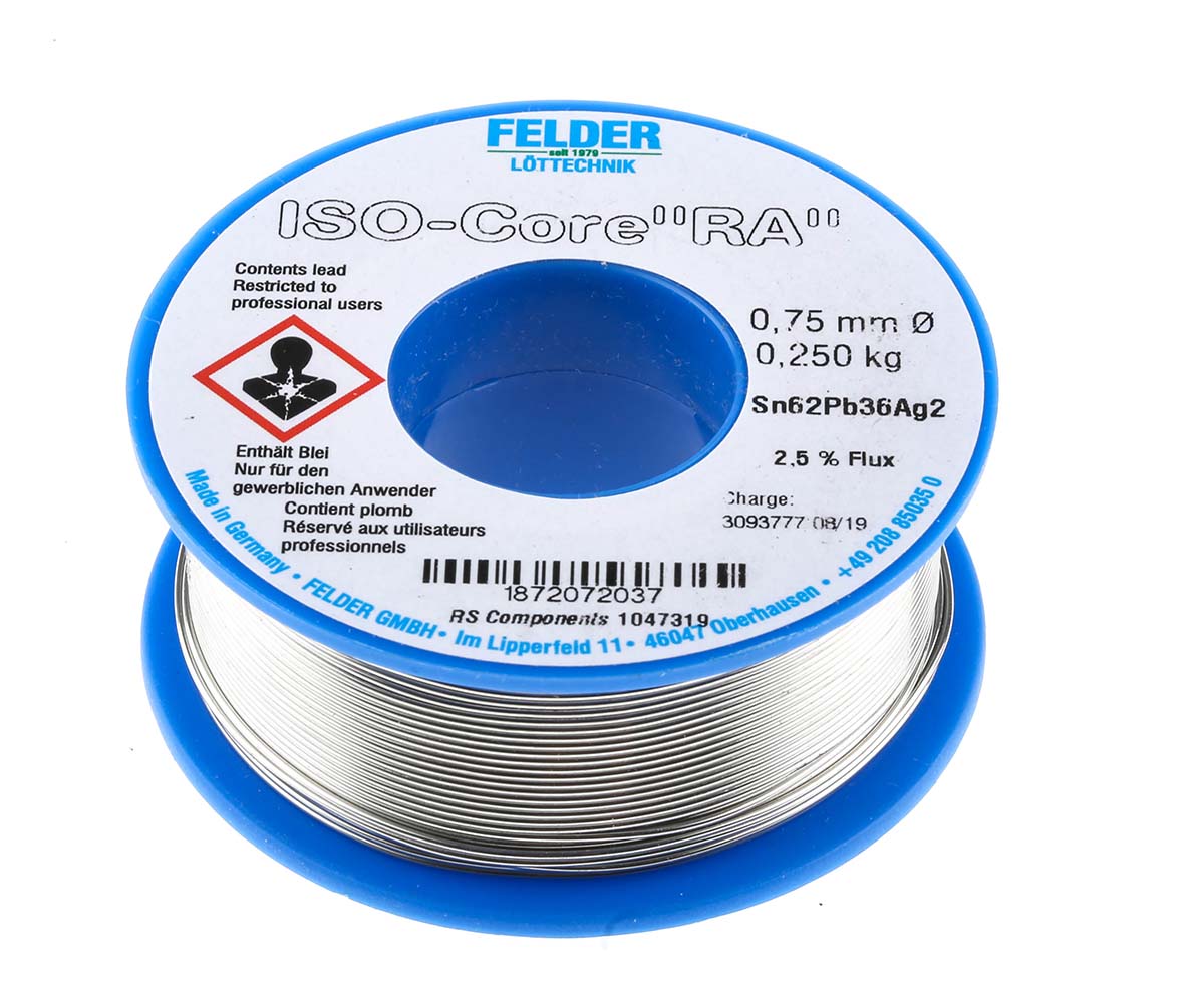This is 0.75mm Wire Lead solder +179°C Melting Point manufactured by Felder Lottechnik. The manufacturer part number is 18.720.72037. It has 62% tin . It is made using 36% lead . It has a melting point of 179°c. The product is in wire form . The wire has 0.75mm diameter. It has a model number iso-core ra. It is a rosin based flux. It includes 2% silver . Its flux content is about 2.5% . The overall weight of the product is about 250g .