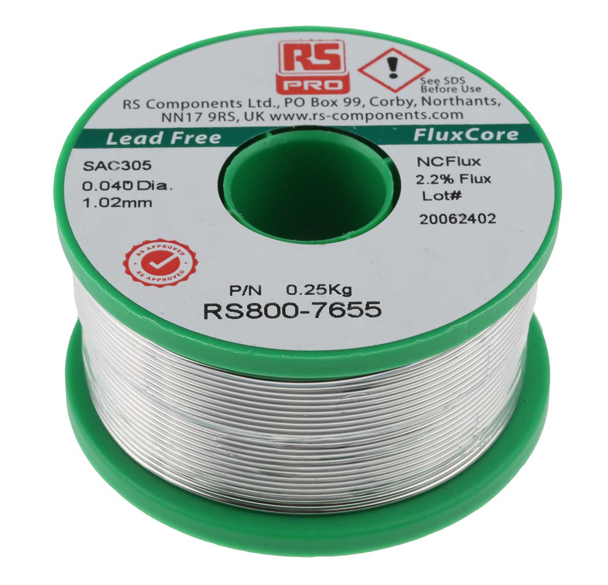 This is 1.01mm Wire Lead Free Solder +217 → +221°C Melting Point manufactured by RS Pro. The manufacturer part number is 800-7655. It has 96.5% tin . It is made using 0% lead . It has a melting point of 217°c. The product is in wire form . It includes 0.5% of copper . The wire has 1.01mm diameter. It has a model number sac305 nc600. It is a rosin based flux. It includes 3% silver . Its flux content is about 2.2% . The overall weight of the product is about 250g .