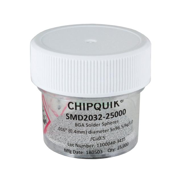 This is manufactured by Chip Quik Inc.. The manufacturer part number is SMD2032-25000. It is assigned with possible HTSUS value of 8311.90.0000. The product is rohs3 compliant. The product is highly reliable with a long-lasting period of 24 months. It comes in solder sphere configuration. It is composed of sn96.5ag3cu0.5 (96.5/3/0.5). It has a melting point of 423 ~ 428°f (217 ~ 220°c). The product is designed as a nice jar. In addition, it is reach unaffected. Its warranty starts from date of manufacture. It is shipped in bulk package . Its typical moisture sensitivity level is not applicable. It has a long 3 weeks standard lead time. Its diameter is 0.016" (0.40mm). It is a lead free process. The product smd2, is a highly preferred choice for users. The product is designated with the ear99 code number.
