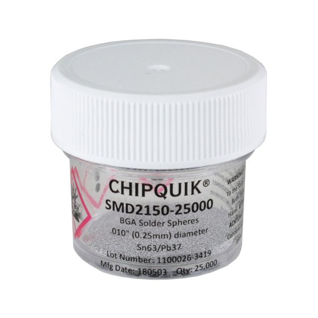 This is manufactured by Chip Quik Inc.. The manufacturer part number is SMD2150-25000. It is assigned with possible HTSUS value of 8311.90.0000. The product is rohs non-compliant. The product is highly reliable with a long-lasting period of 24 months. It comes in solder sphere configuration. It is composed of sn63pb37 (63/37). It has a melting point of 361°f (183°c). The product is designed as a nice jar. In addition, it is reach affected. Its warranty starts from date of manufacture. The chip quik inc.'s product offers user-desired applications. Its typical moisture sensitivity level is not applicable. It has a long 3 weeks standard lead time. Its diameter is 0.010" (0.25mm). It is a leaded process. The product smd2, is a highly preferred choice for users. In addition, bulk is the available packaging type of the product. The product is designated with the ear99 code number.