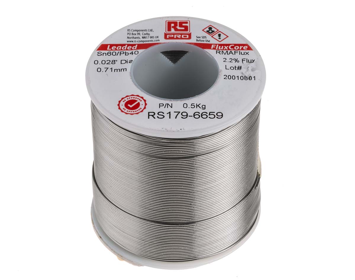 This is 0.7mm Lead solder +183°C Melting Point manufactured by RS PRO. The manufacturer part number is 179-6659. It has 60% tin . It is made using 40% lead . It has a melting point of 183°c. The product is in wire form . The wire has 0.7mm diameter. It has a model number rma200. It is a rosin flux. Its flux content is about 2.2% . The overall weight of the product is about 500g .
