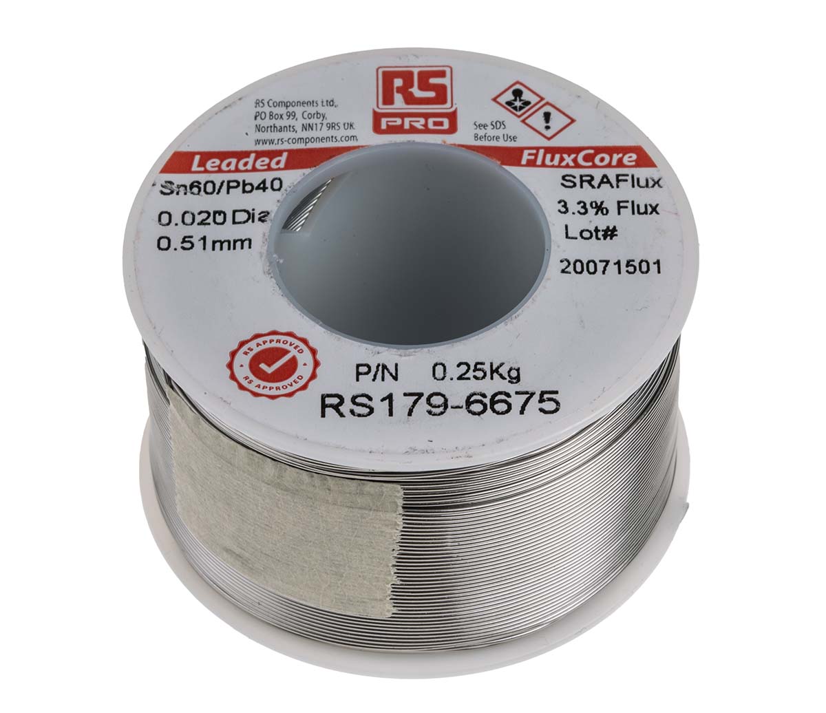 This is 0.5mm Lead solder +183°C Melting Point manufactured by RS PRO. The manufacturer part number is 179-6675. It has 60% tin . It is made using 40% lead . It has a melting point of 183°c. The product is in wire form . The wire has 0.5mm diameter. It has a model number sra500. It is a rosin flux. Its flux content is about 3.3% . The overall weight of the product is about 250g .