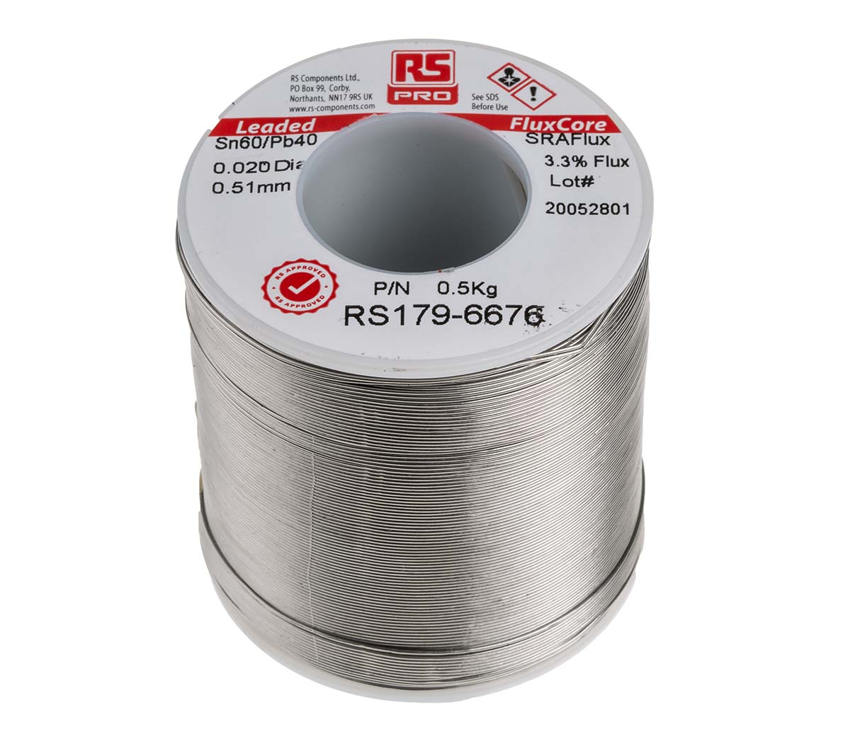 This is 0.5mm Lead solder +183°C Melting Point manufactured by RS PRO. The manufacturer part number is 179-6676. It has 60% tin . It is made using 40% lead . It has a melting point of 183°c. The product is in wire form . The wire has 0.5mm diameter. It has a model number sra500. It is a rosin flux. Its flux content is about 3.3% . The overall weight of the product is about 500g .
