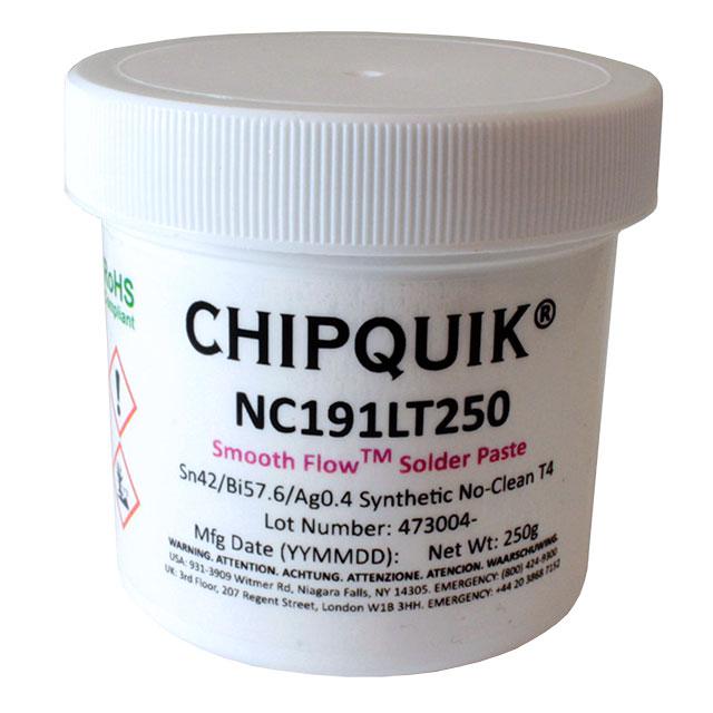This is manufactured by Chip Quik Inc.. The manufacturer part number is NC191LT250. It is assigned with possible HTSUS value of 3810.10.0000. The product is rohs3 compliant. The product is highly reliable with a long-lasting period of 6 months. It comes in solder paste configuration. It is composed of bi57.6sn42ag0.4 (57.6/42/0.4). It has a melting point of 280°f (138°c). The product is designed as a nice jar, 8.8 oz (250g). In addition, it is reach unaffected. Its warranty starts from date of manufacture. It offers storage features at 37°f ~ 46°f (3°c ~ 8°c). The chip quik inc.'s product offers user-desired applications. Its typical moisture sensitivity level is 1 (unlimited). It has a long 4 weeks standard lead time. It is a lead free process. The product smooth flow™, is a highly preferred choice for users. It is a no-clean flux. In addition, bulk is the available packaging type of the product. The mesh is a 4 type of mesh. Moreover, it corresponds to nc191, a base product number of the product. The product is designated with the ear99 code number.