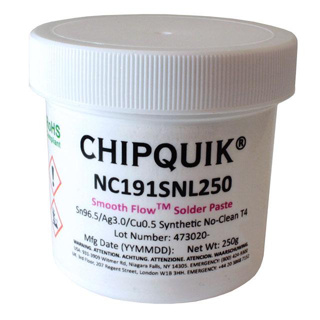 This is manufactured by Chip Quik Inc.. The manufacturer part number is NC191SNL250. It is assigned with possible HTSUS value of 3810.10.0000. The product is rohs3 compliant. The product is highly reliable with a long-lasting period of 6 months. It comes in solder paste configuration. It is composed of sn96.5ag3cu0.5 (96.5/3/0.5). It has a melting point of 422 ~ 428°f (217 ~ 220°c). The product is designed as a nice jar, 8.8 oz (250g). In addition, it is reach unaffected. Its warranty starts from date of manufacture. It offers storage features at 37°f ~ 46°f (3°c ~ 8°c). The chip quik inc.'s product offers user-desired applications. Its typical moisture sensitivity level is 1 (unlimited). It has a long 4 weeks standard lead time. It is a lead free process. The product smooth flow™, is a highly preferred choice for users. It is a no-clean flux. In addition, bulk is the available packaging type of the product. The mesh is a 4 type of mesh. Moreover, it corresponds to nc191, a base product number of the product. The product is designated with the ear99 code number.