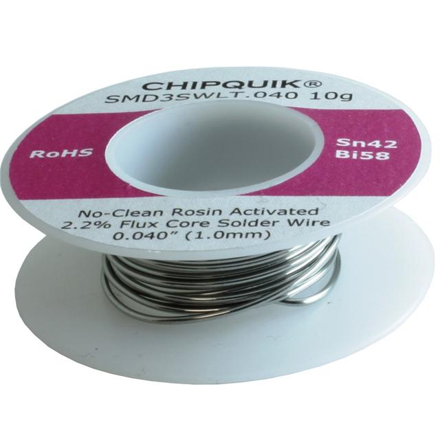 This is manufactured by Chip Quik Inc.. The manufacturer part number is SMD3SWLT.040 10G. It is assigned with possible HTSUS value of 8311.30.6000. The product is rohs3 compliant. It comes in wire solder configuration. It is composed of bi58sn42 (58/42). It has a melting point of 280°f (138°c). The product is designed as a nice spool, 0.35 oz (10g). In addition, it is reach unaffected. The chip quik inc.'s product offers user-desired applications. Its typical moisture sensitivity level is 1 (unlimited). It has a long 4 weeks standard lead time. Its diameter is 0.040" (1.02mm). It is a lead free process. The product smd3, is a highly preferred choice for users. It is a no-clean, rosin activated (ra) flux. In addition, bulk is the available packaging type of the product. Moreover, it corresponds to smd3s, a base product number of the product. The product is designated with the ear99 code number.