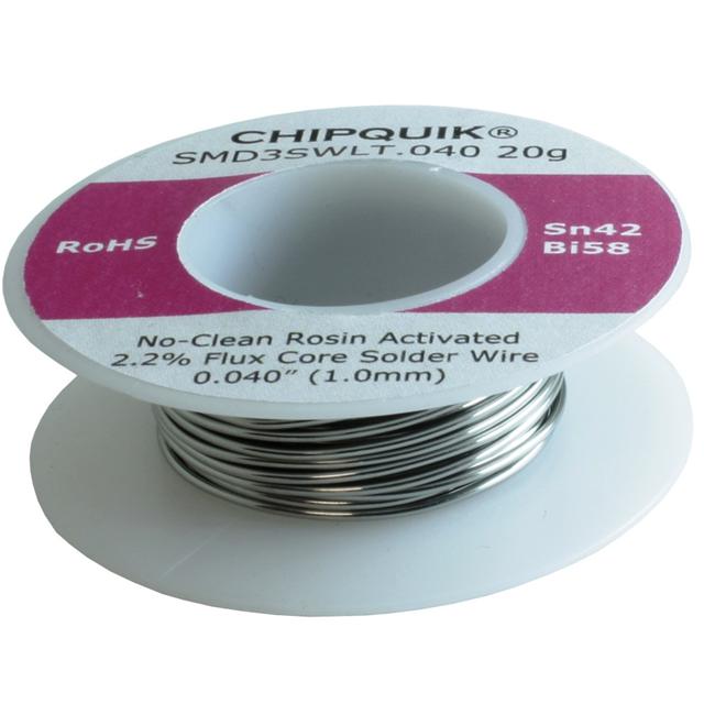This is manufactured by Chip Quik Inc.. The manufacturer part number is SMD3SWLT.040 20G. It is assigned with possible HTSUS value of 8311.30.6000. The product is rohs3 compliant. It comes in wire solder configuration. It is composed of bi58sn42 (58/42). It has a melting point of 280°f (138°c). The product is designed as a nice spool, 0.7 oz (20g). In addition, it is reach unaffected. The chip quik inc.'s product offers user-desired applications. Its typical moisture sensitivity level is 1 (unlimited). It has a long 4 weeks standard lead time. Its diameter is 0.040" (1.02mm). It is a lead free process. The product smd3, is a highly preferred choice for users. It is a no-clean, rosin activated (ra) flux. In addition, bulk is the available packaging type of the product. Moreover, it corresponds to smd3s, a base product number of the product. The product is designated with the ear99 code number.