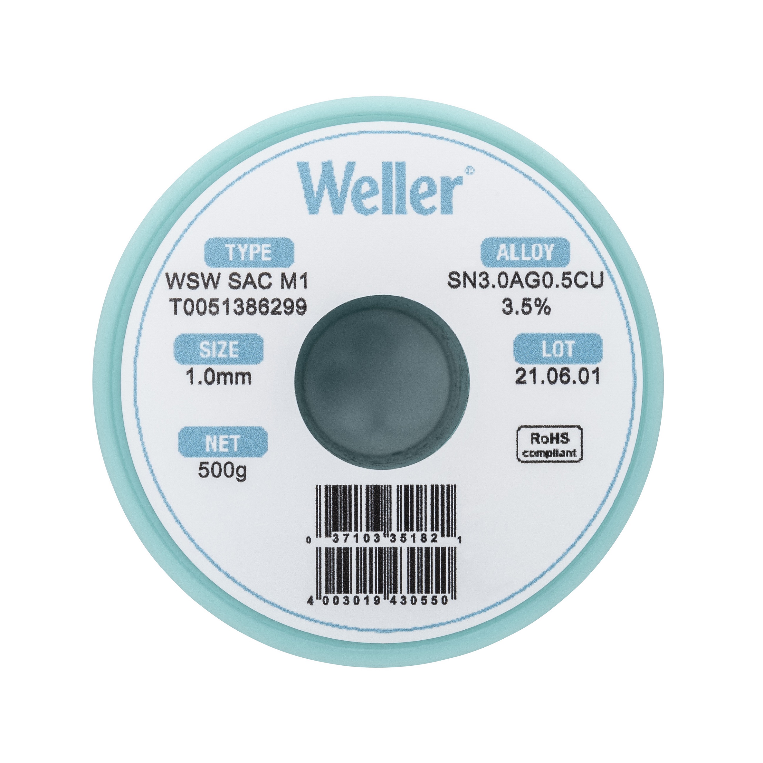 This is Wire 1mm Solder 217 → 221°C Melting Point manufactured by Weller. The manufacturer part number is T0051386299. It has 96.5% tin . It is made using 0% lead . It has a melting point of 217-221°c. The product is in wire form . It includes 0.5% of copper . The wire has 1mm diameter. It has a model number wsw sac m1. It is a m1 flux. It includes 3% silver . Its flux content is about 3.5% . The overall weight of the product is about 500g .
