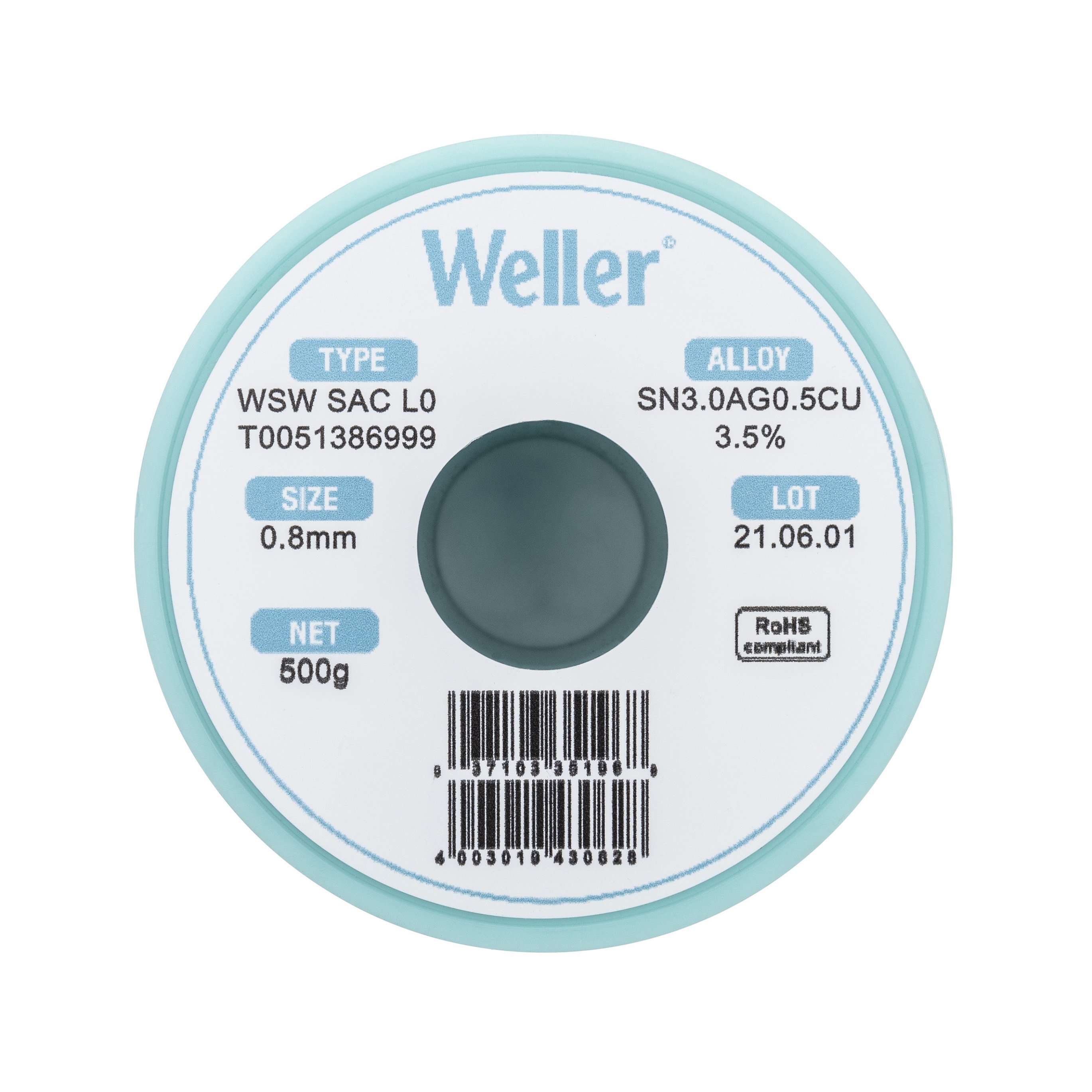 This is Wire 0.8mm Solder 217 → 221°C Melting Point manufactured by Weller. The manufacturer part number is T0051386999. It has 96.5% tin . It is made using 0% lead . It has a melting point of 217-221°c. The product is in wire form . It includes 0.5% of copper . The wire has 0.8mm diameter. It has a model number wsw sac l0. It is a l0 flux. It includes 3% silver . Its flux content is about 3.5% . The overall weight of the product is about 500g .