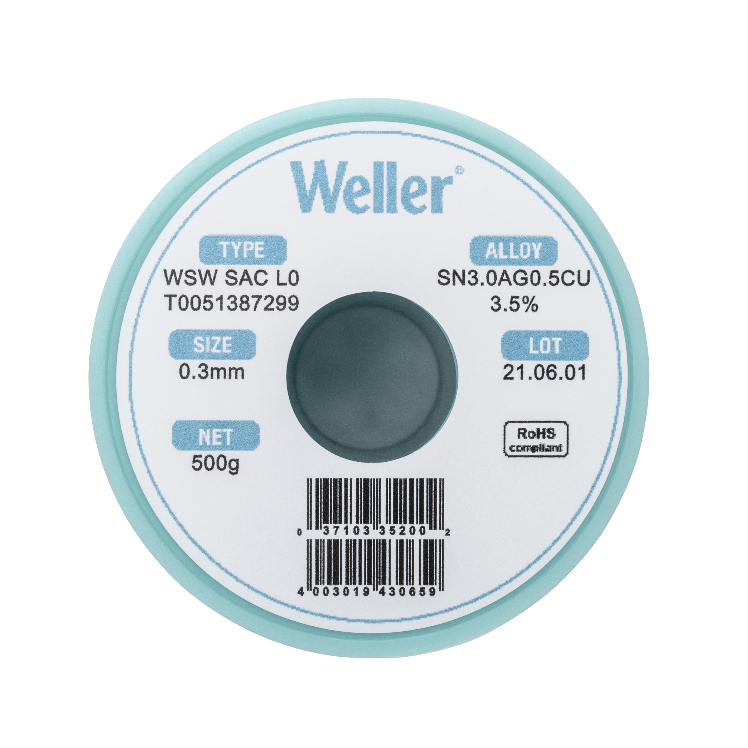 This is Wire 0.3mm Solder 217 → 221°C Melting Point manufactured by Weller. The manufacturer part number is T0051387299. It has 96.5% tin . It is made using 0% lead . It has a melting point of 217-221°c. The product is in wire form . It includes 0.5% of copper . The wire has 0.3mm diameter. It has a model number wsw sac l0. It is a l0 flux. It includes 3% silver . Its flux content is about 3.5% . The overall weight of the product is about 500g .