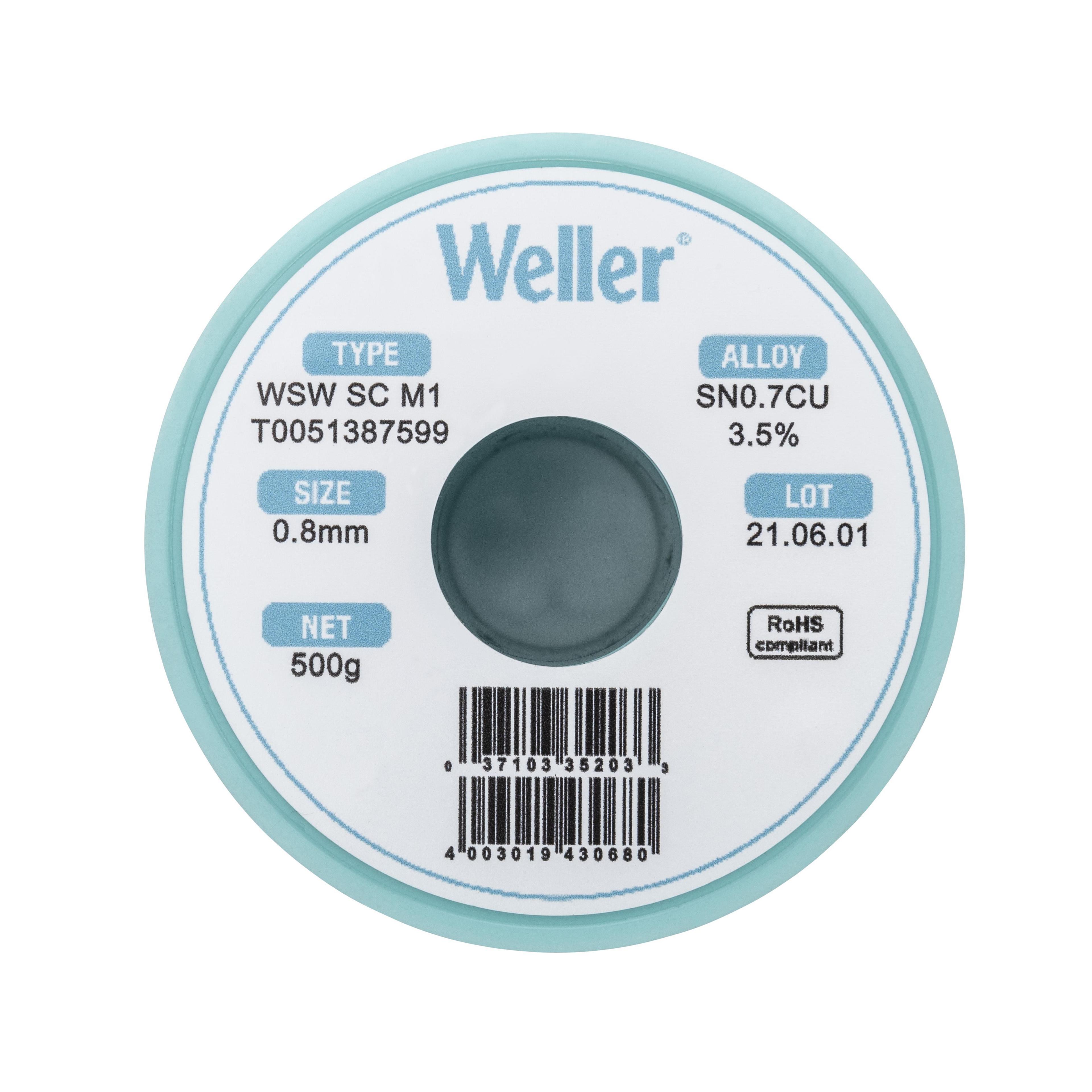 This is Wire 0.8mm Solder 227°C Melting Point manufactured by Weller. The manufacturer part number is T0051387599. It has 99.3% tin . It is made using 0% lead . It has a melting point of 228°c. The product is in wire form . It includes 0.7% of copper . The wire has 0.8mm diameter. It has a model number wsw sc m1. It is a m1 flux. It includes 0% silver . Its flux content is about 3.5% . The overall weight of the product is about 500g .