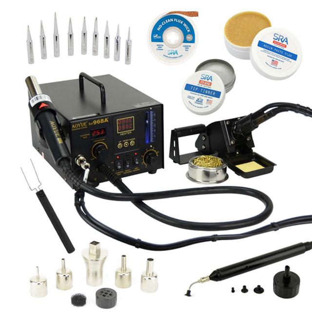 This is manufactured by SRA Soldering Products. The manufacturer part number is AO968A+SRAKIT1. It is assigned with possible HTSUS value of 8515.11.0000. The product is rohs3 compliant. The possible product's input voltage is 110v. It comes in rework, soldering configuration. Workstand Included - 2663. The product is also supplied with heating element, iron stand, micro tweezers, power cord, soldering iron, tips. It is supplied with 1 channels. The product's typical temperature range incudes 212°f ~ 896°f (100°c ~ 480°c). It is shipped in box package . Its typical moisture sensitivity level is not applicable. It has a long 4 weeks standard lead time. The supplied tips/nozzles are at-5. It is also supplied with aoc009. The product aoyue®, is a highly preferred choice for users. This product carries 500w. It is supplied with a robust [Control/Display] control/display. Furthermore, the output voltage is 24v. The product is designated with the ear99 code number.