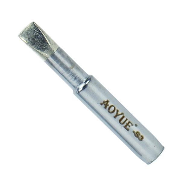 This is manufactured by SRA Soldering Products. The manufacturer part number is AOT-S3. It is assigned with possible HTSUS value of 8515.90.4000. The product is rohs compliant. The built-in exquisite tip is a soldering tip. In addition, it is reach unaffected. The sra soldering products's product offers user-desired applications. Its typical moisture sensitivity level is 1 (unlimited). It has a long 5 weeks standard lead time. The product aoyue®, is a highly preferred choice for users. In addition, bag is the available packaging type of the product. The product is suitable for use with tesla, 469, 701, 702, 703, 703b, 768, 926, 927, 928, 936, 936a, 937, 937+, 9378, 968, 908, 938, 9378. The tip is designed with a chisel shape. The product is designated with the ear99 code number.
