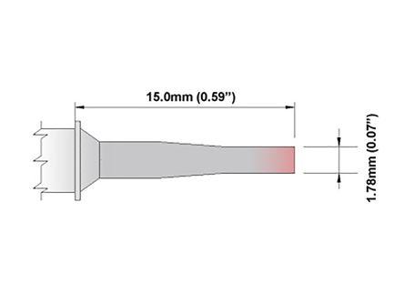 This is 1.78 mm 60° Chisel Soldering Iron Tip manufactured by Thermaltronics. The manufacturer part number is M7LR403. The tip is 1.78 mm in size. Its tip is of m series . Its tip is at 60° angle . The product is highly suitable for mx-500, mx-5000, mx5200, tmt-9000s-1, tmt-9000s-2. The tip is designed with a straight chisel shape.