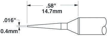 This is 0.4 mm Straight Conical Soldering Iron Tip manufactured by OK International. The manufacturer part number is STTC-145. Its tip is of sttc series . The tip is designed with a straight conical shape. The tip is 0.4 mm in size. The product is highly suitable for mx-500 & mx-5000 systems; mx-rm3e & mx-h1-av hand-pieces.