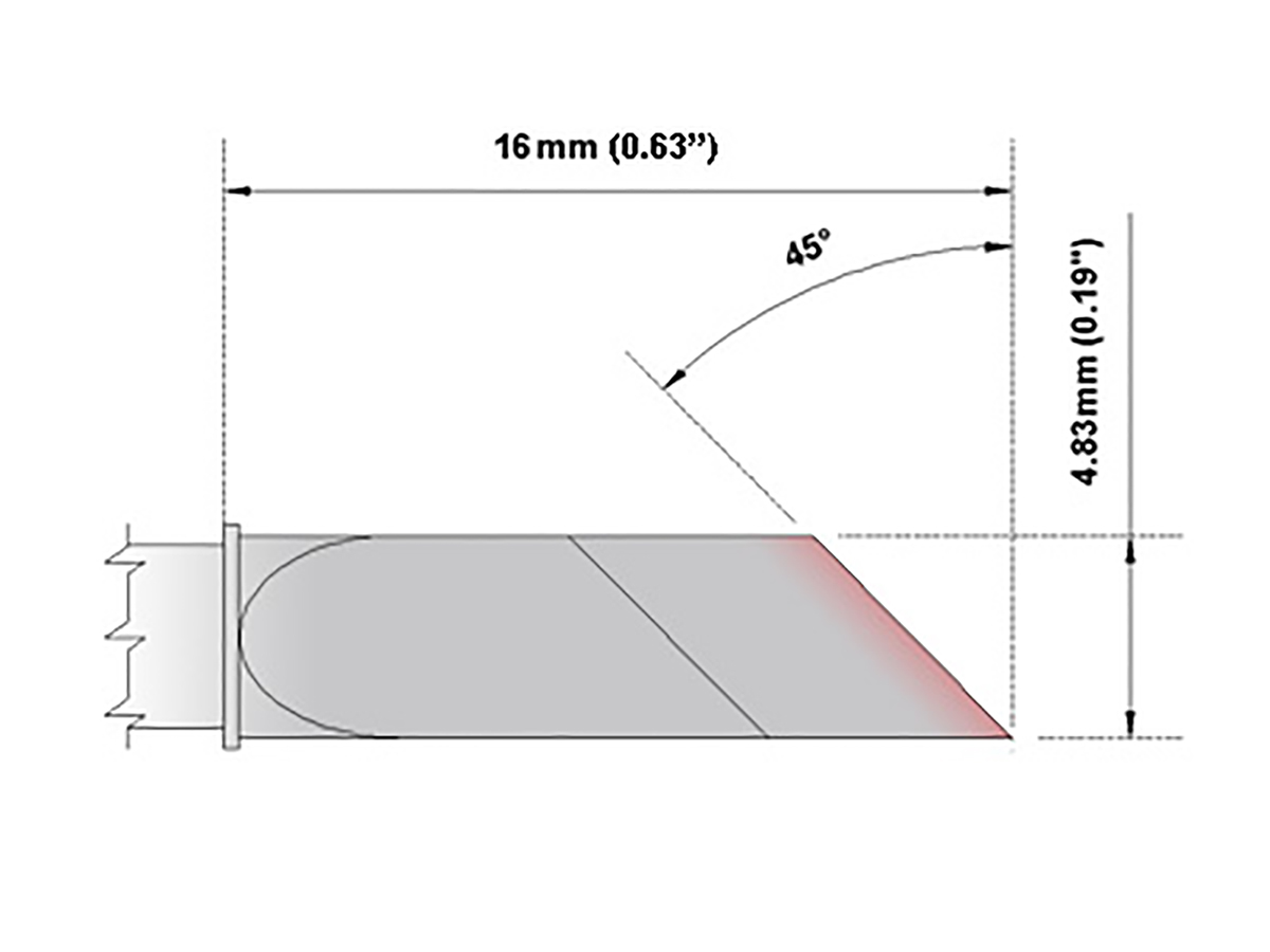 This is 4.83 mm 45° Knife Soldering Iron Tip for use with TMT-9000S-1 TMT-9000S-2 manufactured by Thermaltronics. The manufacturer part number is M7DS526. The tip is 4.83 mm in size. Its tip is of m series . Its tip is at 45° angle . The product is highly suitable for mx-500, mx-5000, mx5200, tmt-9000s-1, tmt-9000s-2. The tip is designed with a straight knife shape.